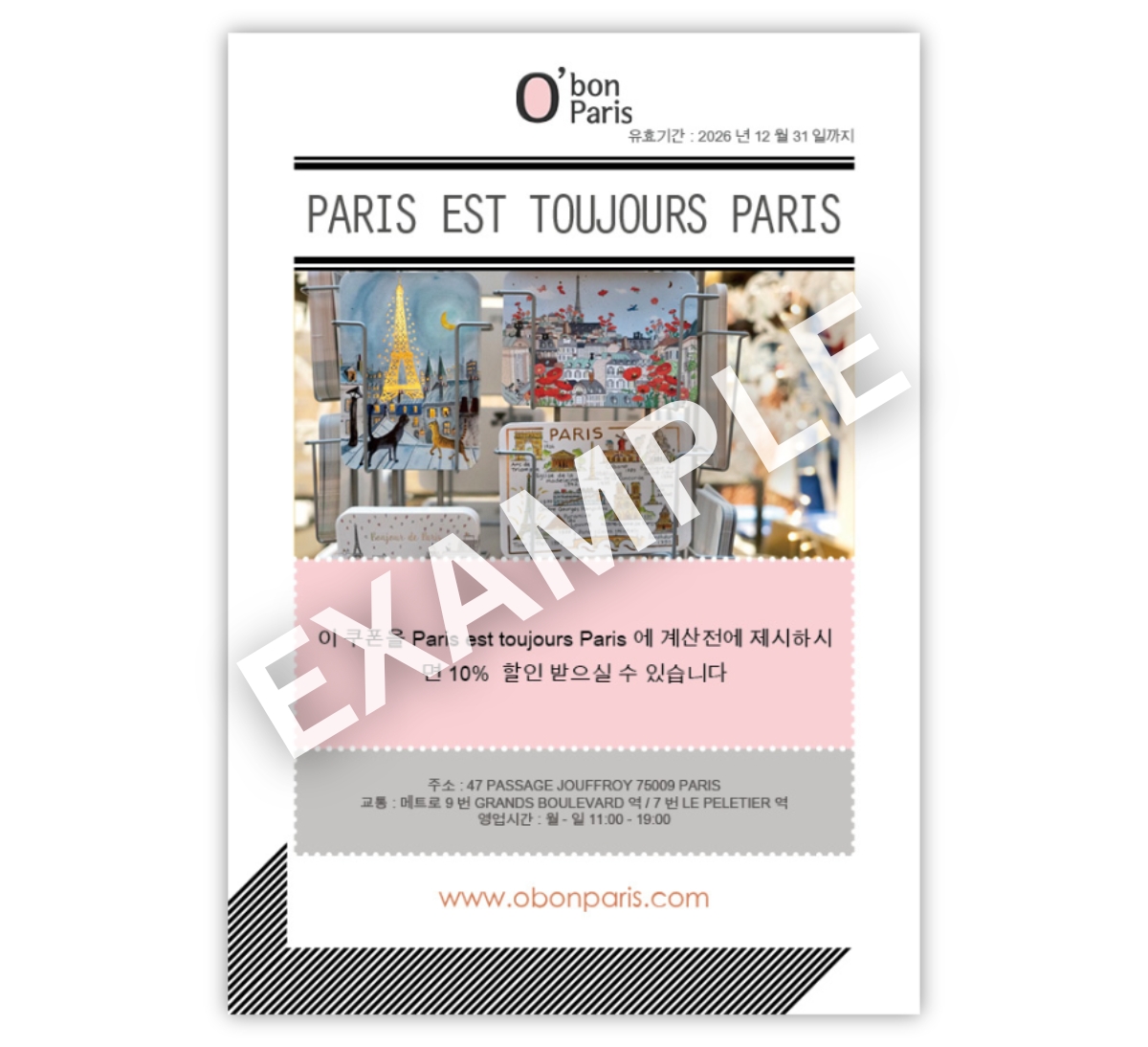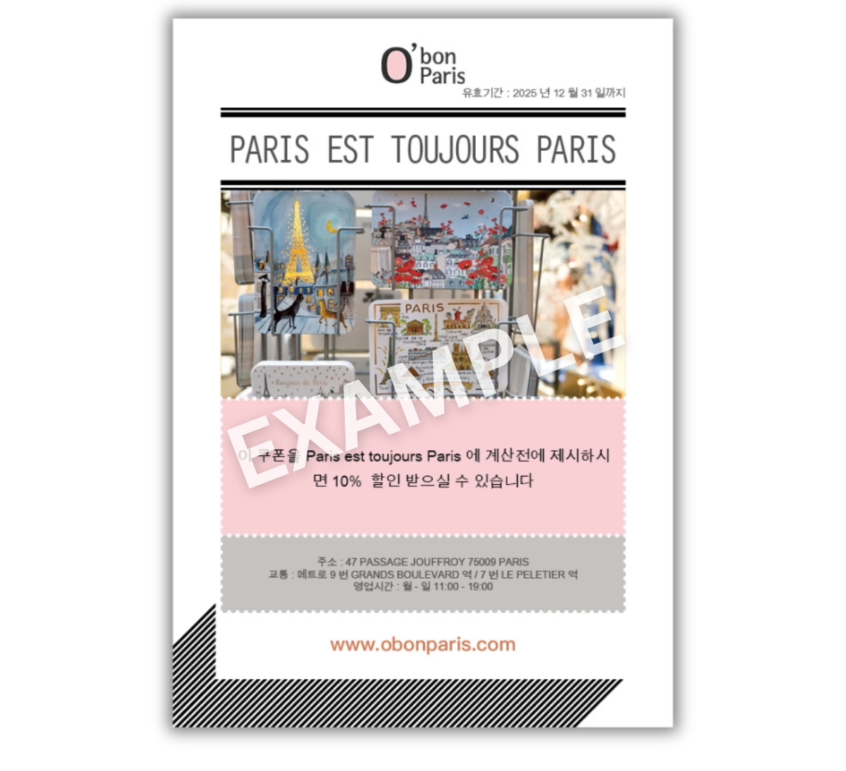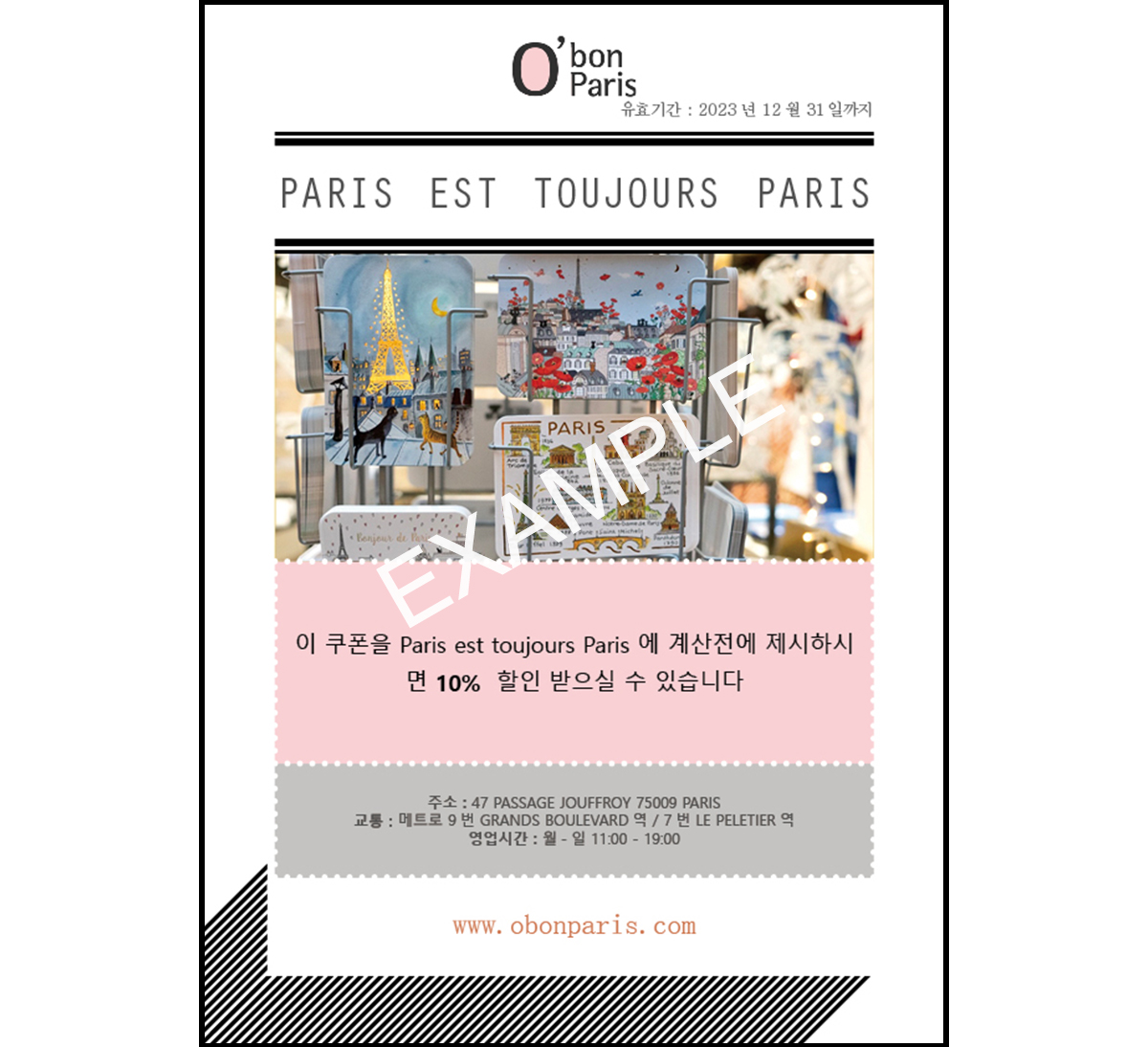 4) PARIS EST TOUJOURS PARIS 매장에 방문해 오봉파리 할인쿠폰을 제시 후 10% 할인이 적용됩니다.