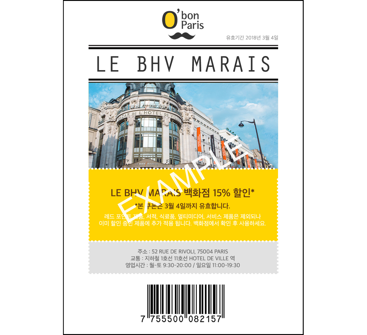4) BHV MARAIS에서 계산 시 쿠폰을 제시하시고 15% 할인을 받으세요.