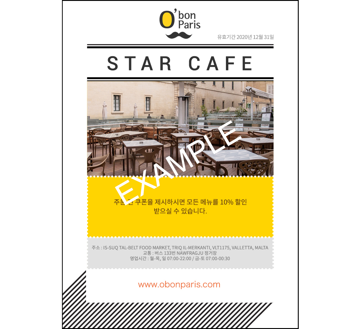 - 식사 주문 전 오봉파리 쿠폰을 제시하시면 10% 할인을 받으실 수 있습니다.