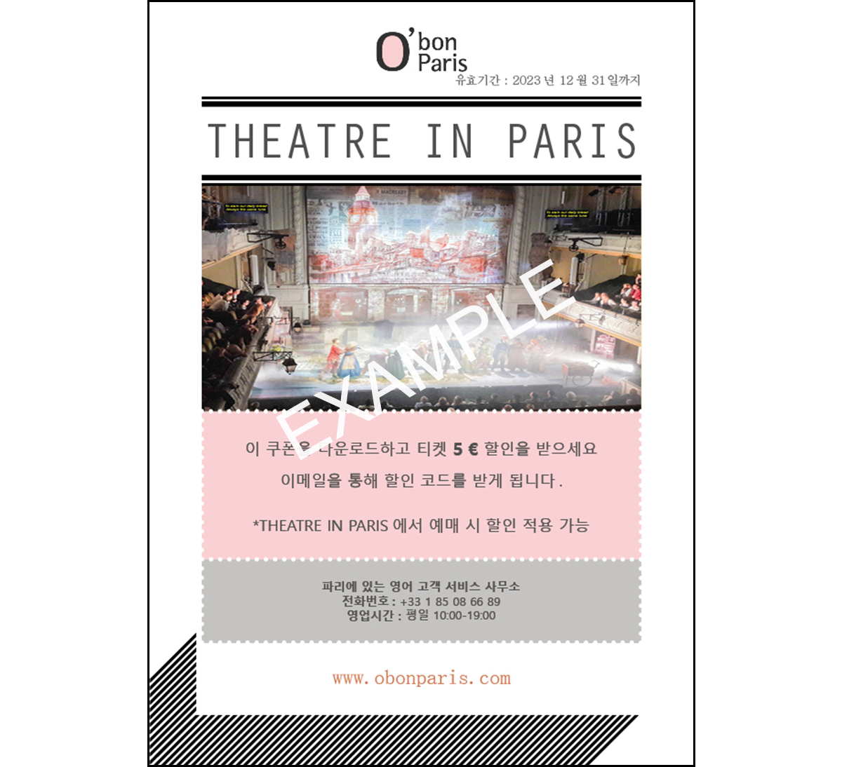 - Theatre in Paris 관련 문의사항이 있을 경우 여기로 연락주세요. +33 01 45 72 72 00 (주중 10:00 - 19:00)