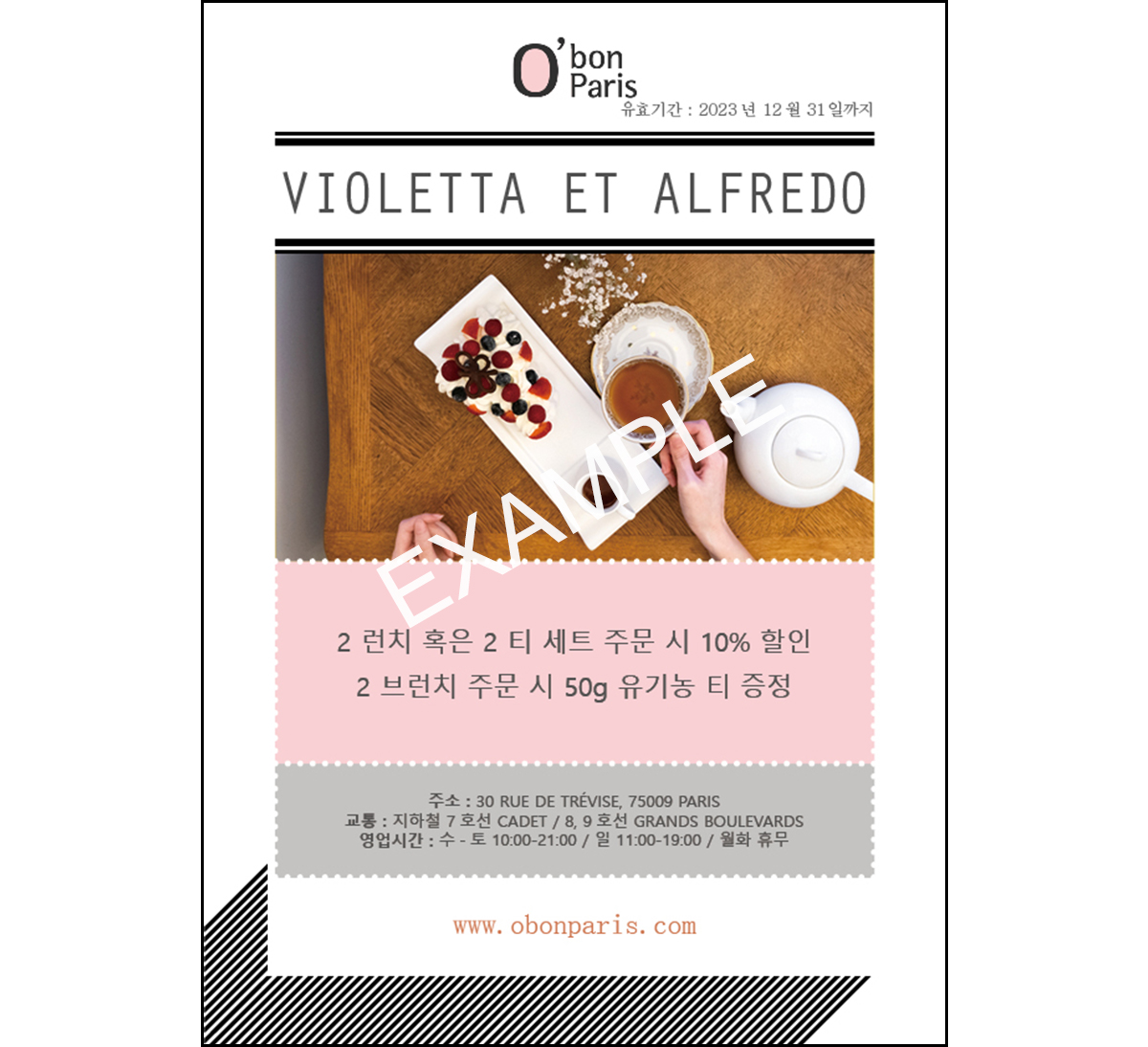 Violetta et Alfredo에서 브런치 세트를 2인 이상 주문하면 50g의 유기농 티를 제공하며 2인 이상의 티타임 세트, 점심식사, 저녁식사를 주문하면 10% 할인 혜택을 받으실 수 있습니다.