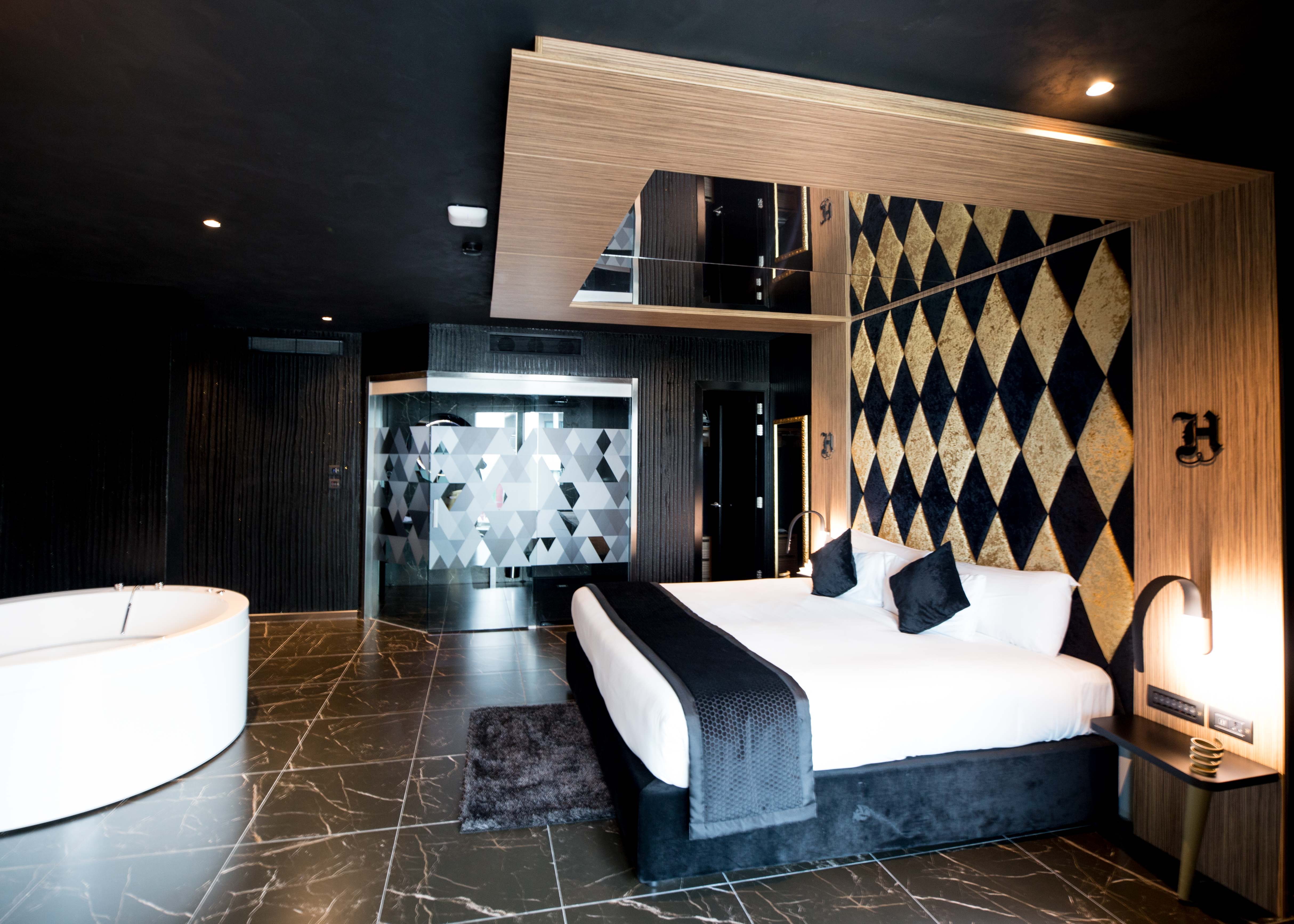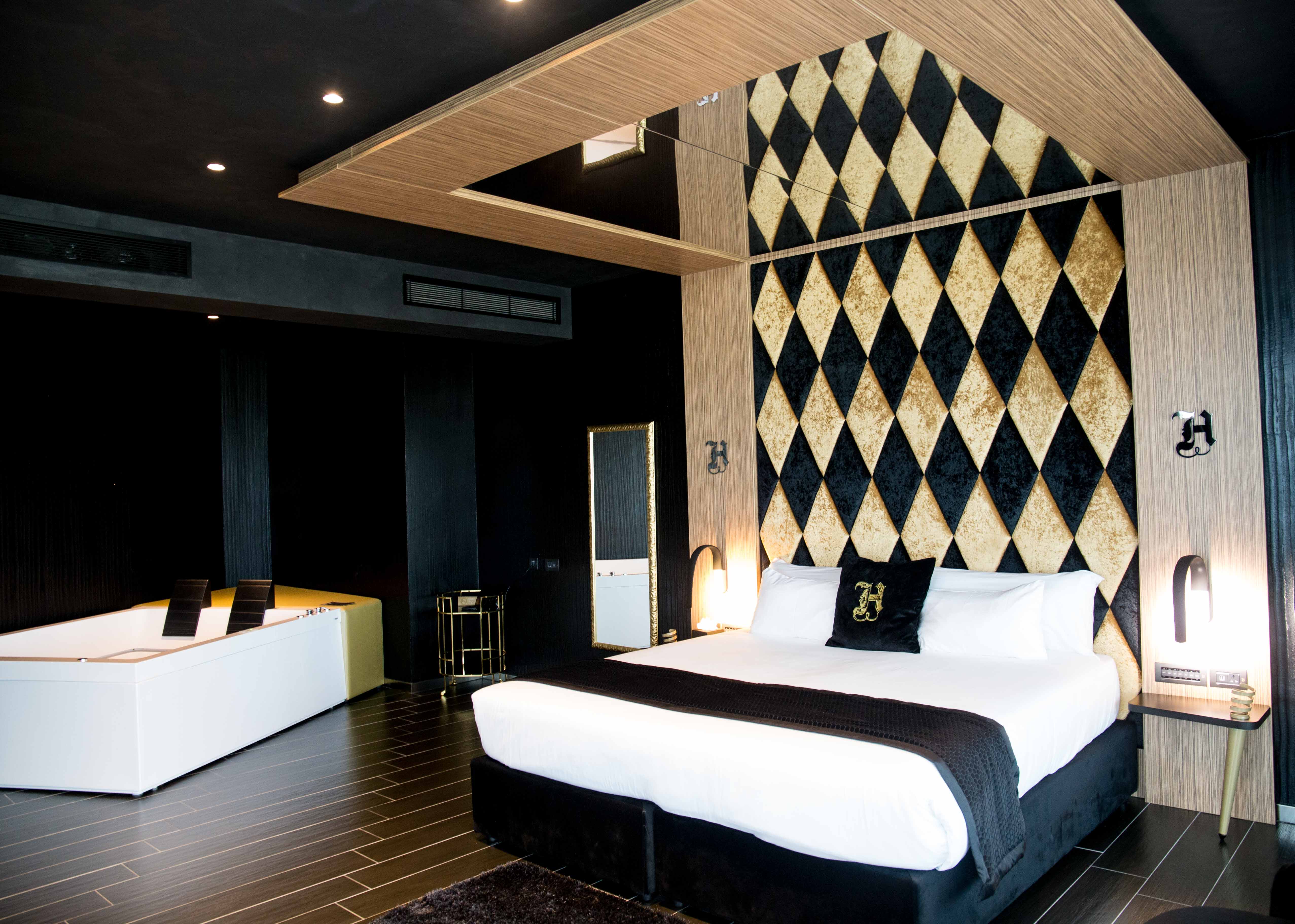 H Hotel 방 내부도 골드 블랙을 기본으로 대리석과 모던한 가구들로 꾸며져 있어 전반적으로 현대적이면서도 깔끔한 분위기를 자아낸다. 럭셔리 자쿠지 스위트룸인만큼 충분히 넓은 공간에 킹사이즈 베드와 프라이뱃 이태리식 라운드 자쿠지가 있다.