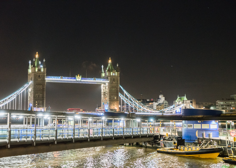 템즈 강 다리 중 가장 화려한 타워 브리지. 중세시대 성같이 아름다운 외관 덕분에 런던의 랜드마크 중 하나가 되어 가끔씩 런던 브리지로 오인되는 경우도 많다. 타워 브리지는 1886년에서 1894 년 사이에 지어졌고, 큰 배가 지날 때에는 중앙을 개방하는 데 놓치기 아까운 장면이라 사전에 꼭 개방시간을 알아보자. 개방 시간은 타워 브리지 웹사이트 에서 확인할 수 있다. 두 개의 탑을 연결하는 위층 통로는 얼마든지 올라갈 수 있고, 템즈 강을 42m 높이에서 구경 할 수 있는 드문 장소다.