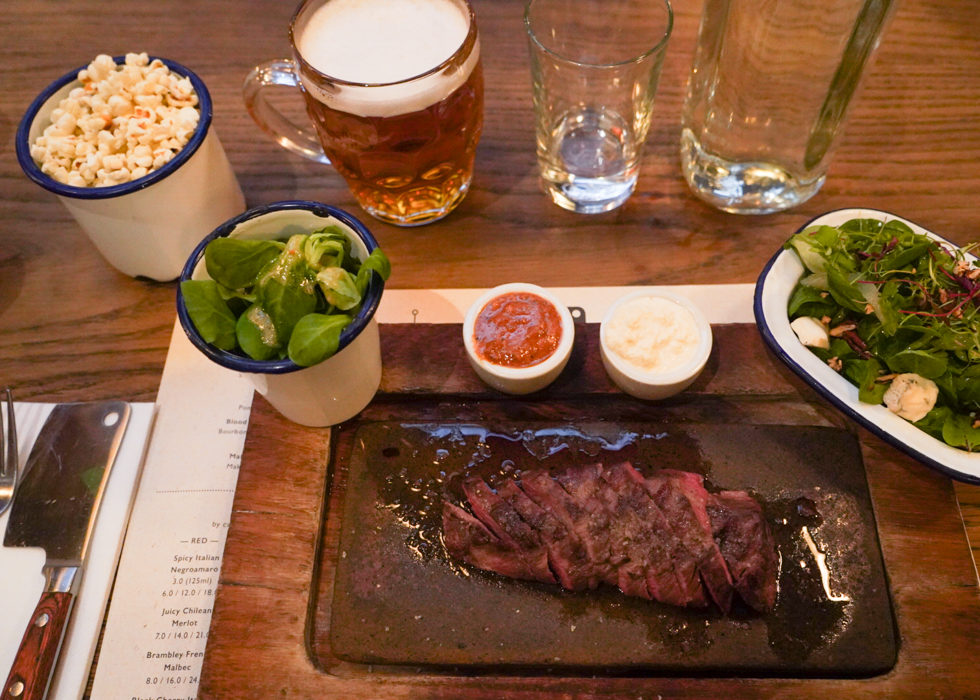 플랫 아이언은 런던에서 저렴하고 맛있는 걸로 유명한 스테이크 레스토랑으로, 세인트 판크라스 역 근처에 체인점이 하나 있다. 런던에서 스테이크는 대체로 20파운드 정도 되지만 플랫 아이언에서는 무려 11파운드로 저렴한 가격을 자랑한다.여기에 사이드 메뉴와 소스를 추가하거나 고기를 업그레이드 할 수 있다. 맛도 꽤 좋아 퀄리티 걱정은 없다. 플랫 아이언에서는 예약이 없기 때문에 피크 타임에는 대기하는 사람이 많다. 조금 일찍 방문하는 것을 추천.