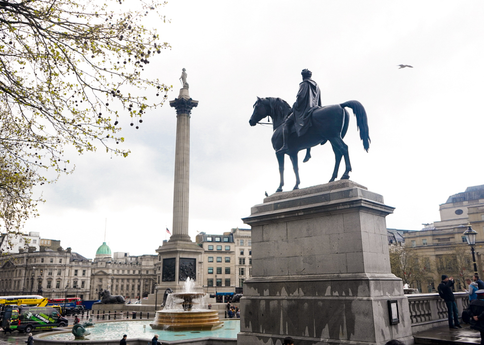 트라팔가 광장은 런던에서 가장 붐비는 장소 중 하나. 박물관, 미술관, 역사적 건축물에 둘러싸인 특별한 분위기가 특징이다. 1812년 건축가 존 내쉬John Nash가 일반 시민을 위한 문화 공간으로 개발을 시작, 1830년 트라팔가 해전의 승리를 기념하여 지금의 이름이 되었다. 현재는 런던 시민들의 좋은 휴식처나 만남의 장소가 되었다. 사진 속 동상의 주인공은 넬슨 제독.