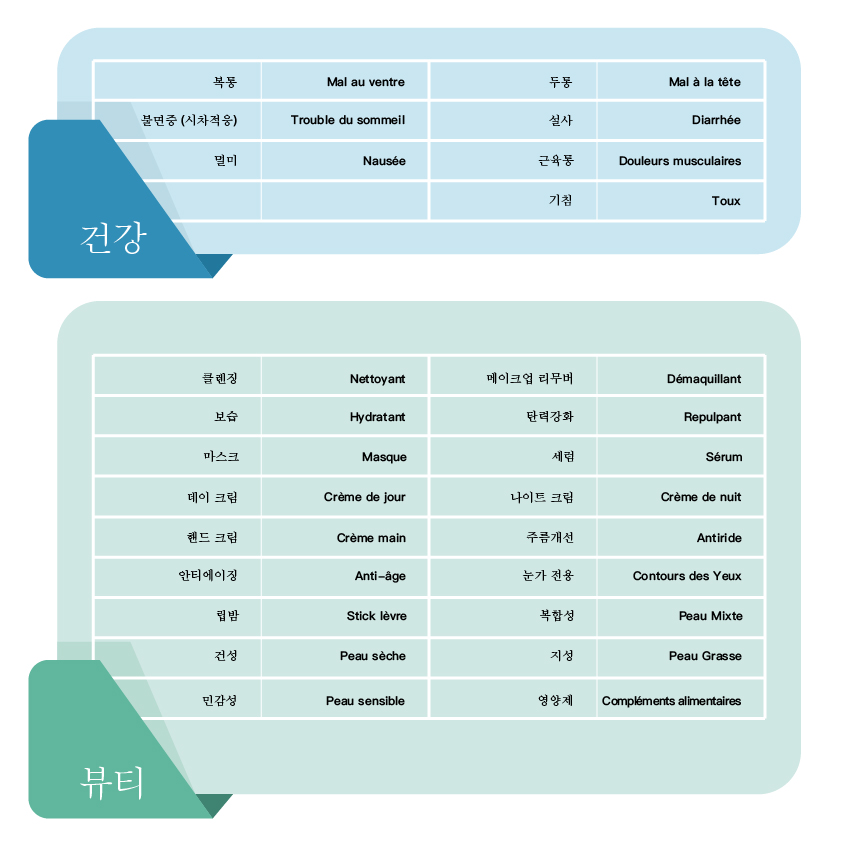 위 단어들은 뷰티 용품 관련 프랑스어다. 프랑스 약국 화장품은 한국에서도 유명한 편이니 구입시 참고하자.