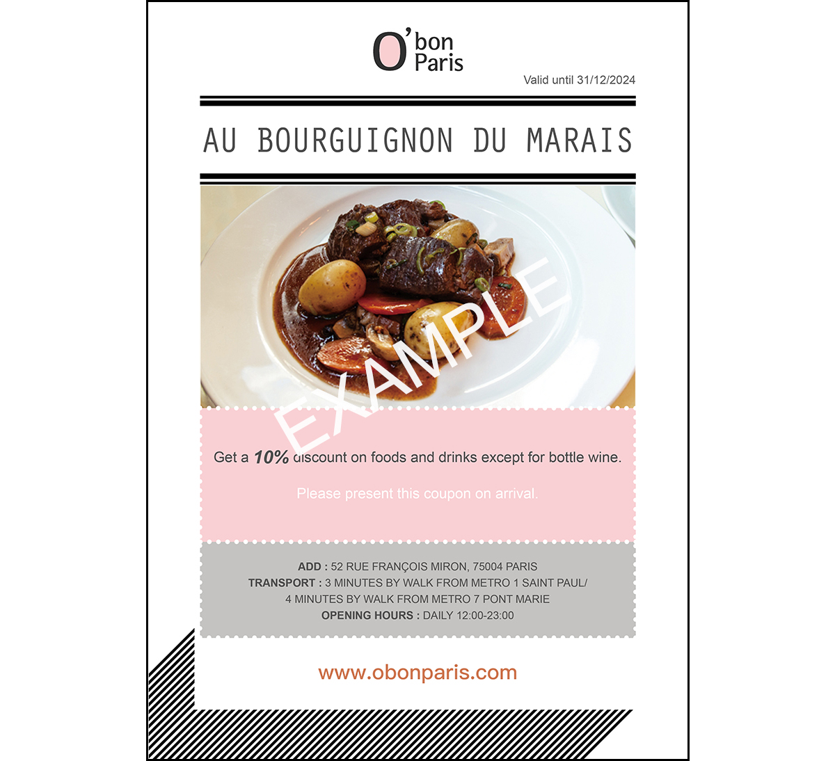 Visite o AU BOURGUIGNON DU MARAIS, apresente o cupom e aproveite seu desconto.