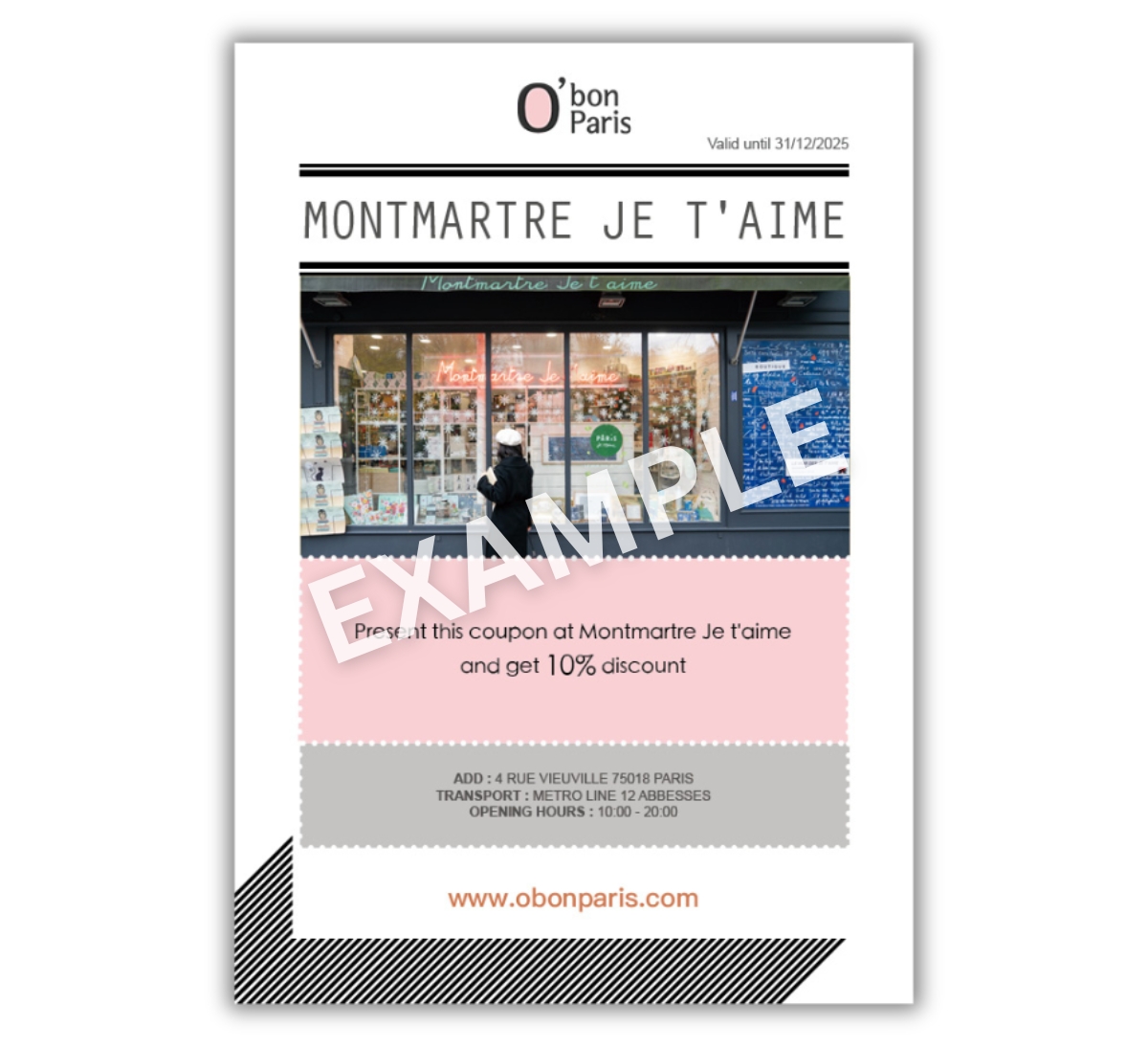 Montmartre tem muitas atrações, incluindo o famoso Muro do Amor. Montmartre Je t'aime é a loja oficial dos produtos do Muro do Amor, a poucos passos do local que encanta os amantes de todo o mundo. Você pode encontrar souvenirs com o tema do Muro do Amor, a icônica obra de arte de Montmartre, o lar de artistas. Com o cupom O'bon Paris, você pode obter 10% de desconto na sua compra.