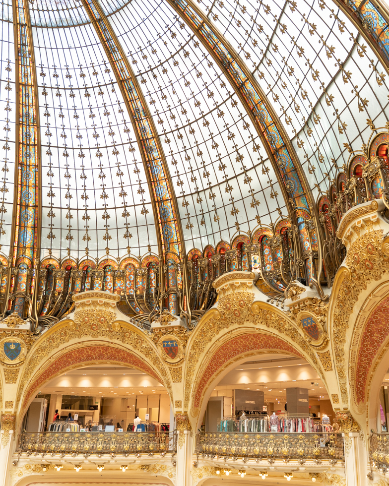 Nossa primeira parada é o icônico Galeries Lafayette, mais especificamente a Coupole (Cúpula). Este não é apenas um paraíso de compras; é uma obra-prima visual. A cúpula, com seu design deslumbrante de vitrais e detalhes intricados, é uma maravilha arquitetônica que oferece um fundo único para suas fotos. Capture a essência da elegância parisiense enquanto admira o caleidoscópio de cores lançadas pela luz do sol que atravessa a cúpula. O interior luxuoso da loja de departamentos, com suas varandas opulentas e o elegante estilo Art Nouveau, adiciona um toque de sofisticação às suas fotos. Não se esqueça de olhar para cima e apreciar a grandiosidade da Coupole, fazendo seu feed do Instagram se destacar de verdade.