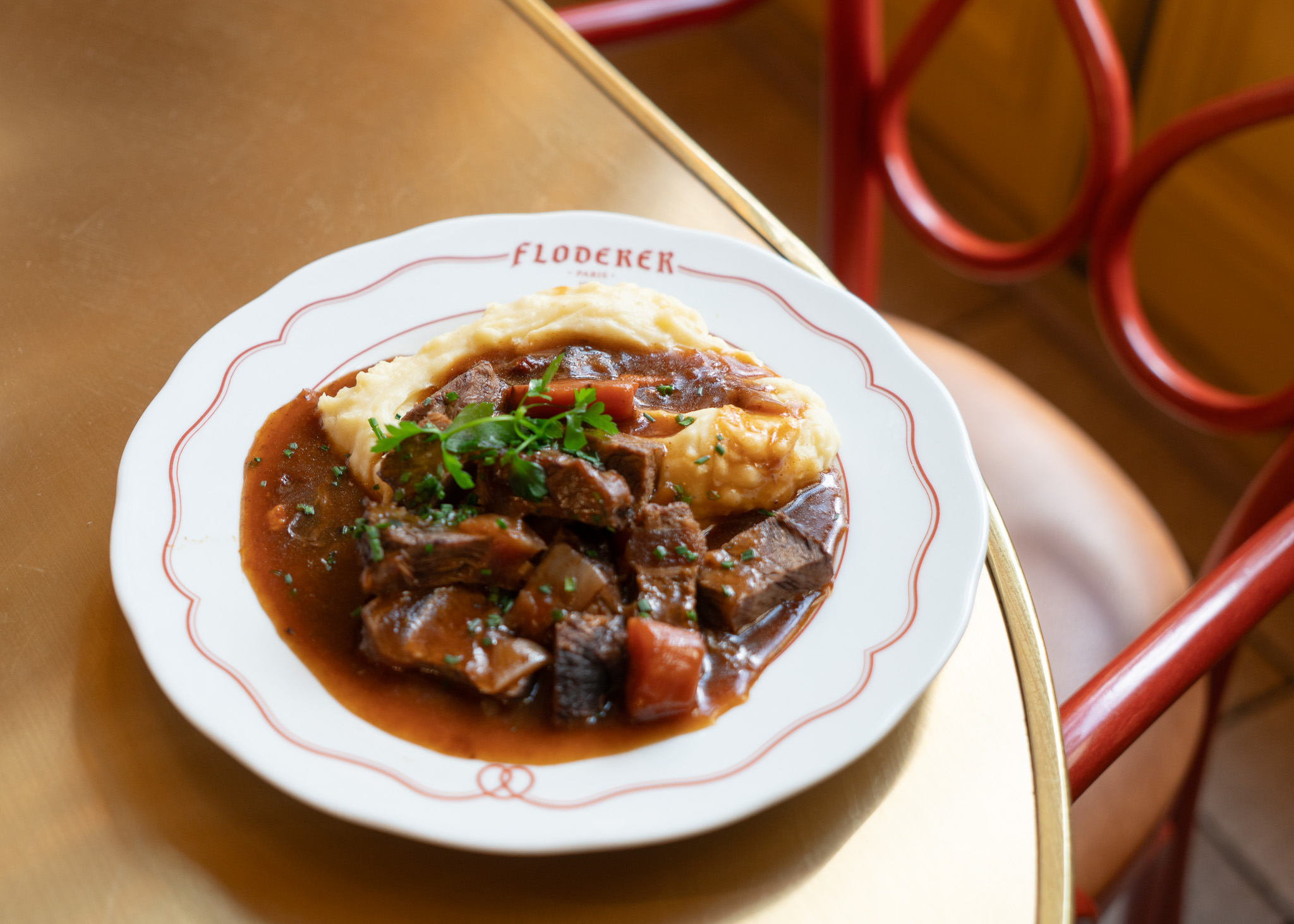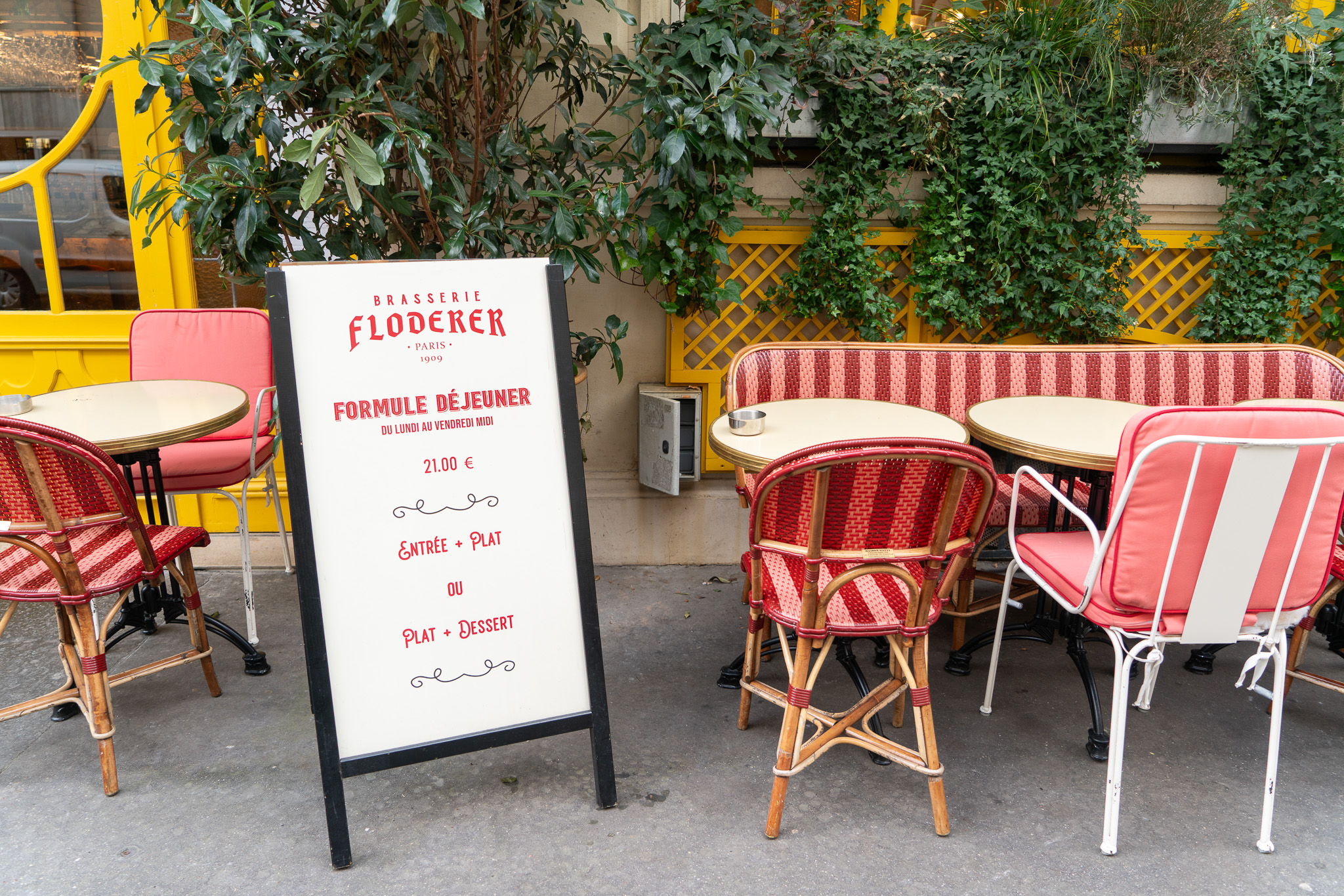Como uma clássica brasserie parisiense, a Floderer oferece uma ampla seleção de pratos tradicionais franceses a preços acessíveis. O restaurante possui um menu fixo que muda regularmente, incluindo uma entrada e um prato principal, ou um prato principal e uma sobremesa por €21. Além disso, há uma grande variedade de entradas, pratos principais e sobremesas para escolher.