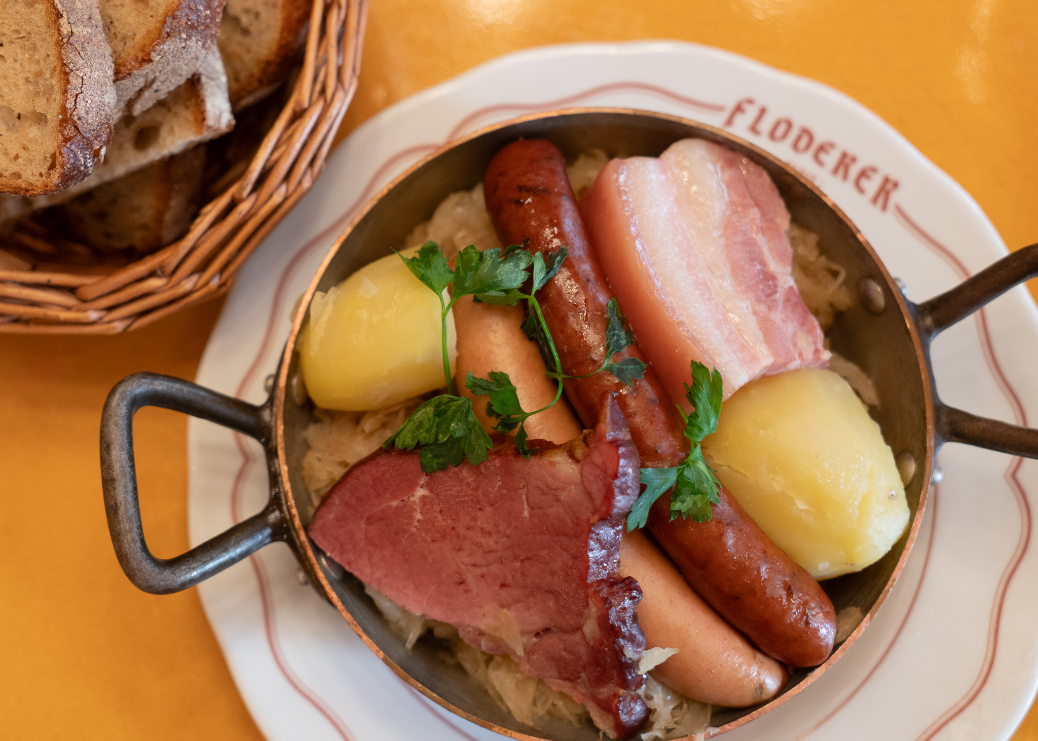 Como a brasserie foi fundada por alsacianos, o cardápio também inclui pratos tradicionais dessa região, sendo o mais famoso a choucroute—um delicioso prato de chucrute servido com uma variedade de carnes defumadas e cozidas.