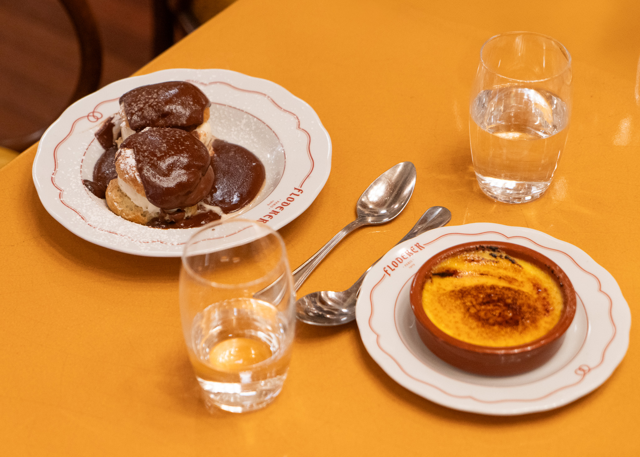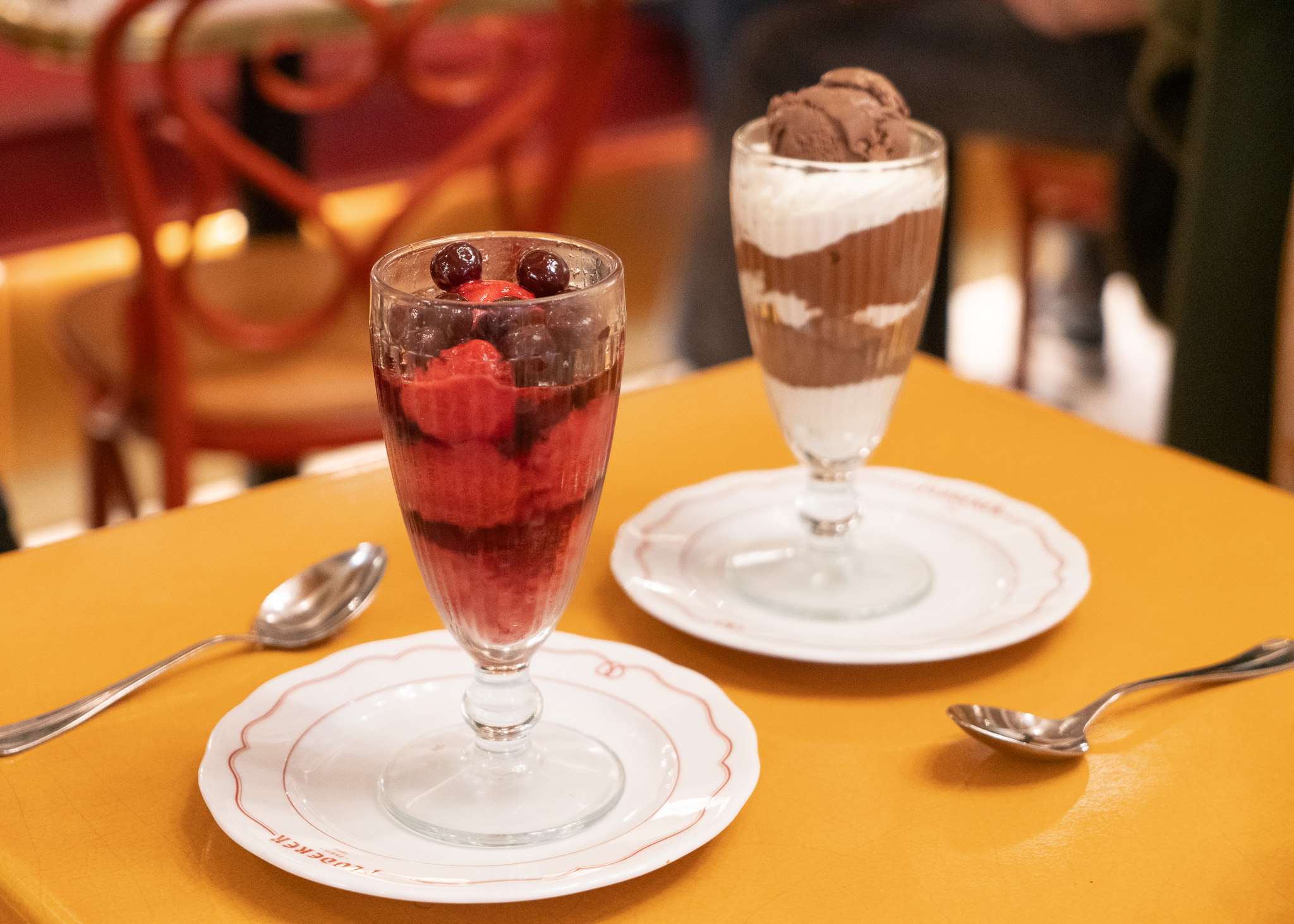 Eles também oferecem uma variedade de taças de sorvete, sendo a especialidade da casa a "Flo Cup"—uma deliciosa combinação de sorvete de cereja, cerejas e kirsch (licor de cereja).