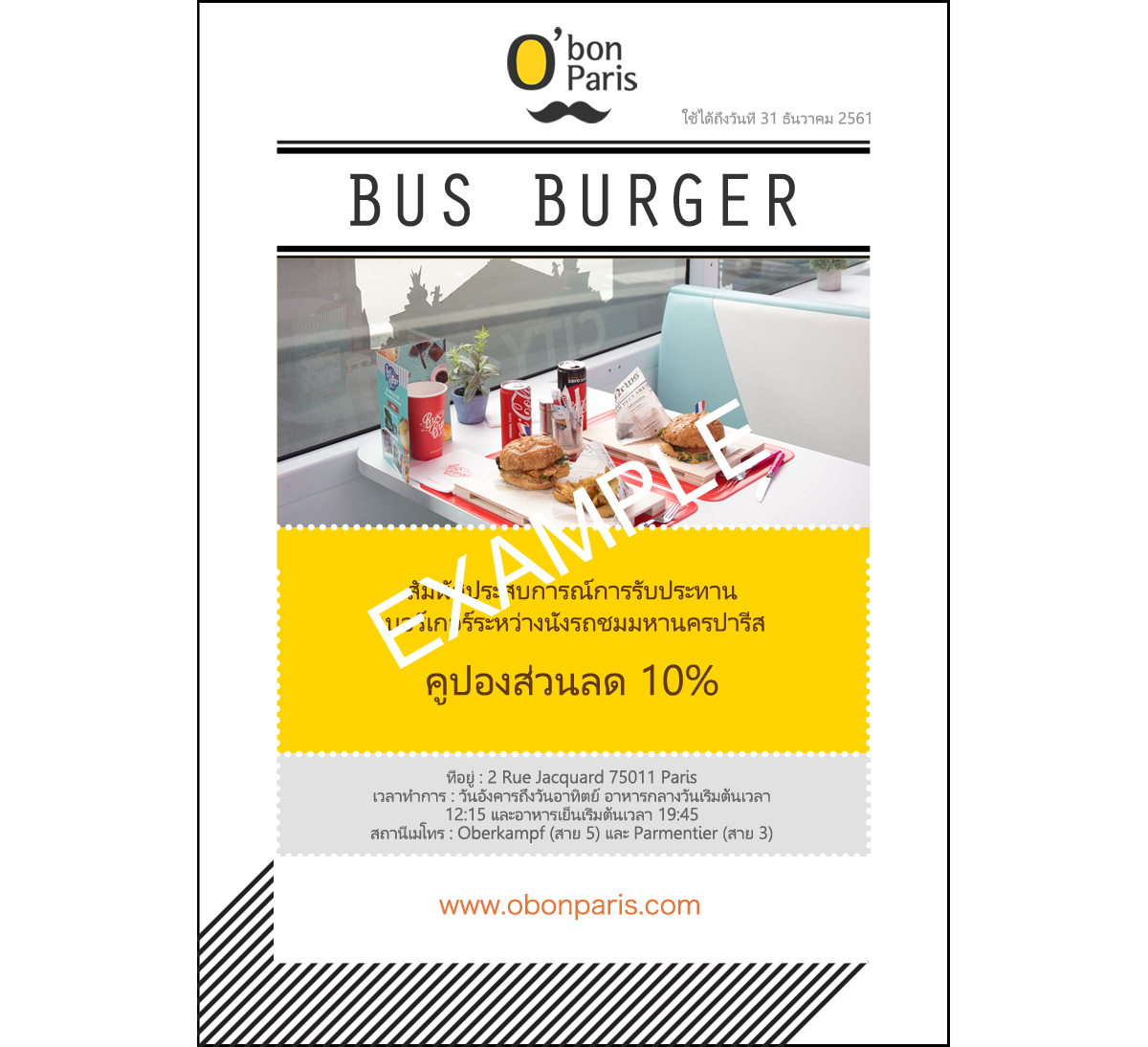 - กรุณาสำรองที่นั่งที่เว็บไซต์ https://www.bus-burger.com/copie-de-reservation และจ่ายเงินค่ามัดจำ 18€ ค่าอาหารเพิ่มเติมจะถูกหักส่วนลดจากคูปอง 10%
