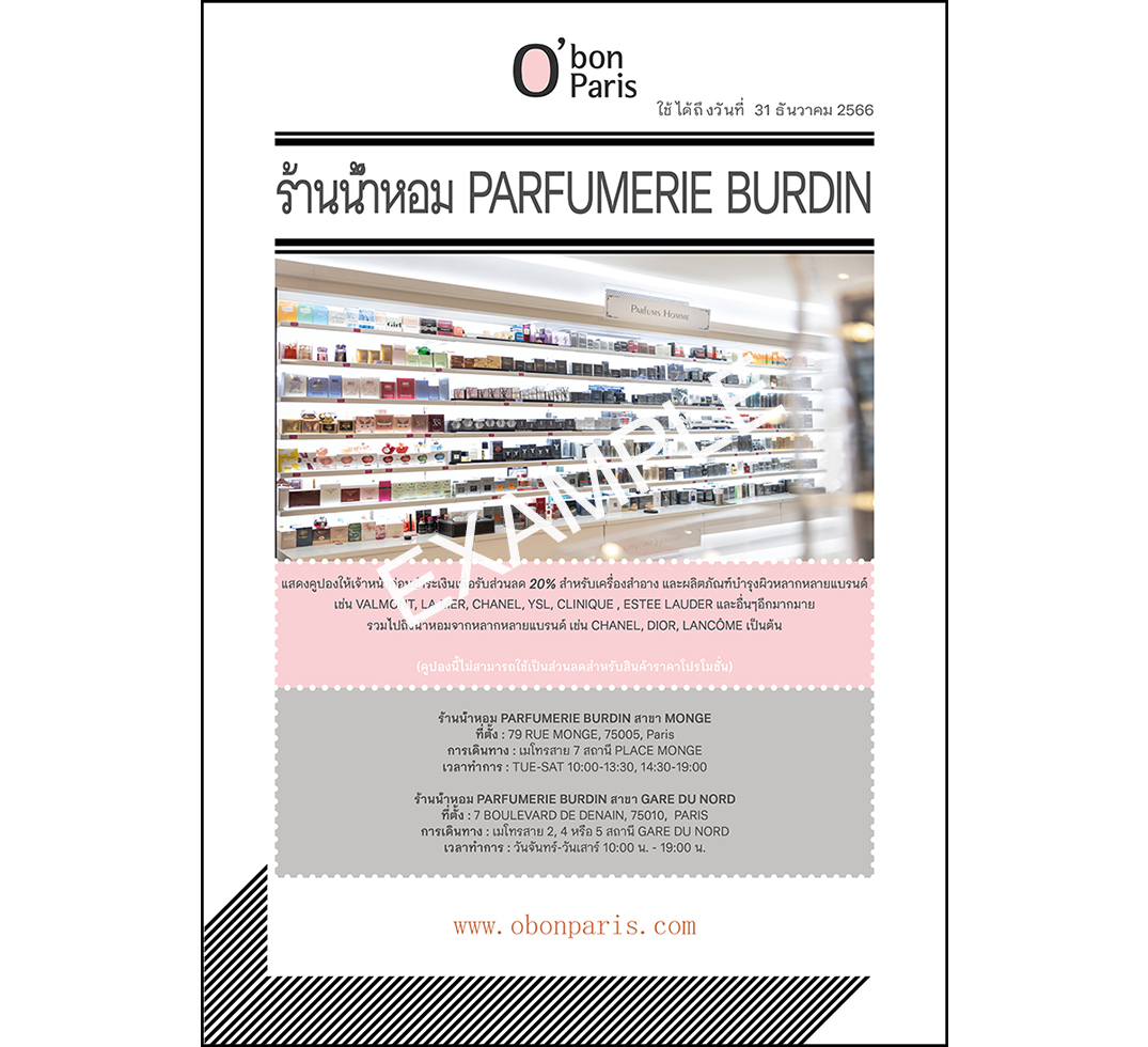 - ที่ PARFUMERIE BURDIN คุณสามารถใช้คูปองส่วนลด 15% จาก O'bon Paris พร้อมกับรับการคืนภาษีเพิ่มอีก 15% เมื่อซื้อสินค้าครบ 100€ ขึ้นไป