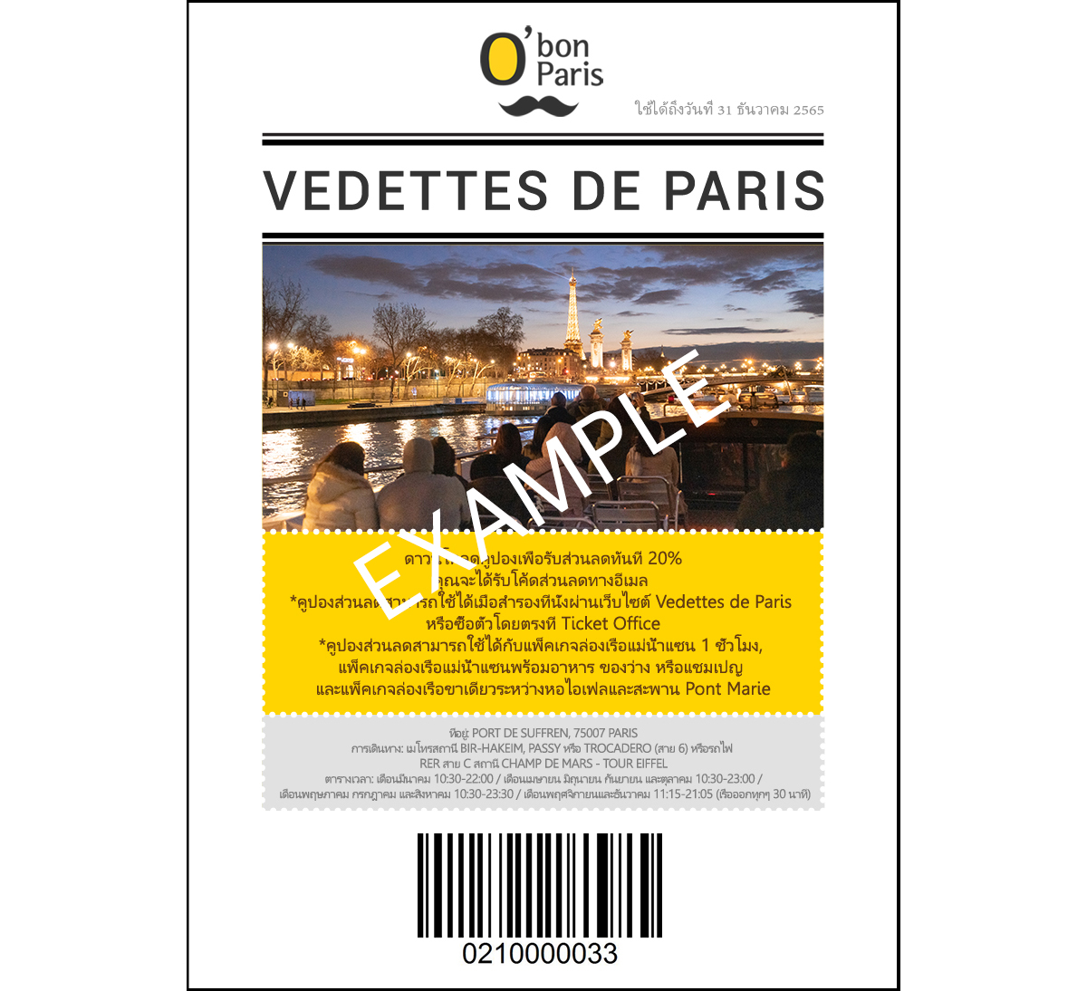 - เพื่อรับส่วนลด 20% คลิกที่ลิ้งค์ที่ปรากฏในอีเมลเพื่อสำรองที่นั่งผ่านเว็บไซต์ Vedettes de Paris และใส่โค้ดส่วนลดที่ได้รับทางอีเมล หรือแสดงคูปองส่วนลดเมื่อซื้อตั๋วโดยตรงที่ Ticket Office