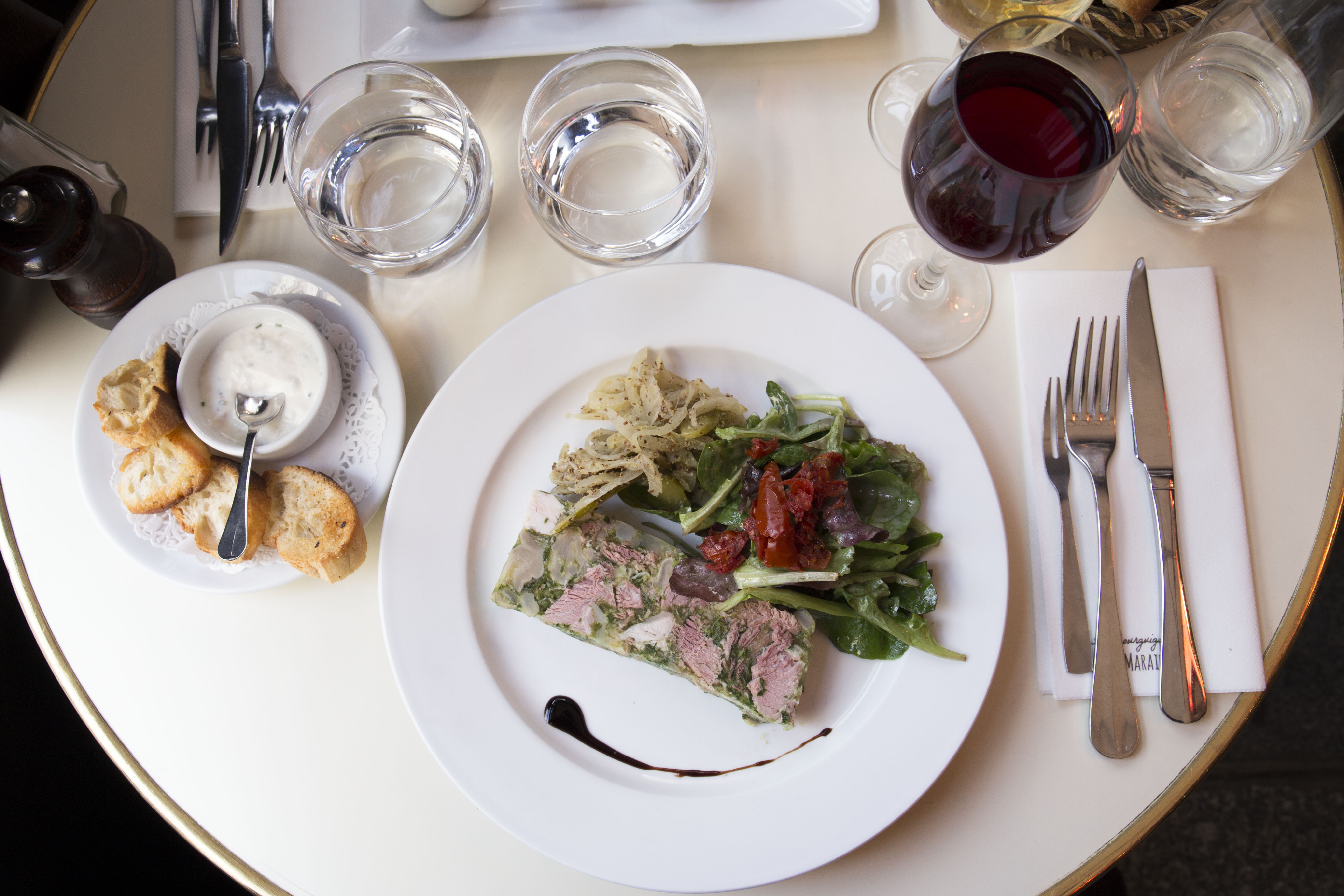 เมื่อไปถึงร้านอาหาร พนักงานให้การต้อนรับอย่างอบอุ่นและเป็นกันเอง ทางร้านมีโต๊ะทั้งด้านในและด้านนอกร้านอาหาร ที่เหมาะสำหรับวันที่อากาศดีๆ รับแดดอุ่นๆ พร้อมเฝ้ามองดูผู้คนที่สัญจรไปมาบนถนน ในช่วงเวลาเที่ยงแบบนี้ เป็นช่วงที่คนออกมารับประทานอาหารกลางวันกันเป็นจำนวนมาก ทำให้มีผู้คนเข้ามาจับจองโต๊ะนั่งรับประทานอาหารกันมากขึ้นเรื่อยๆ นอกจากนักท่องเที่ยวแล้ว ร้านนี้ยังเป็นร้านอาหารร้านโปรดของชาวปารีเซียงอีกด้วย