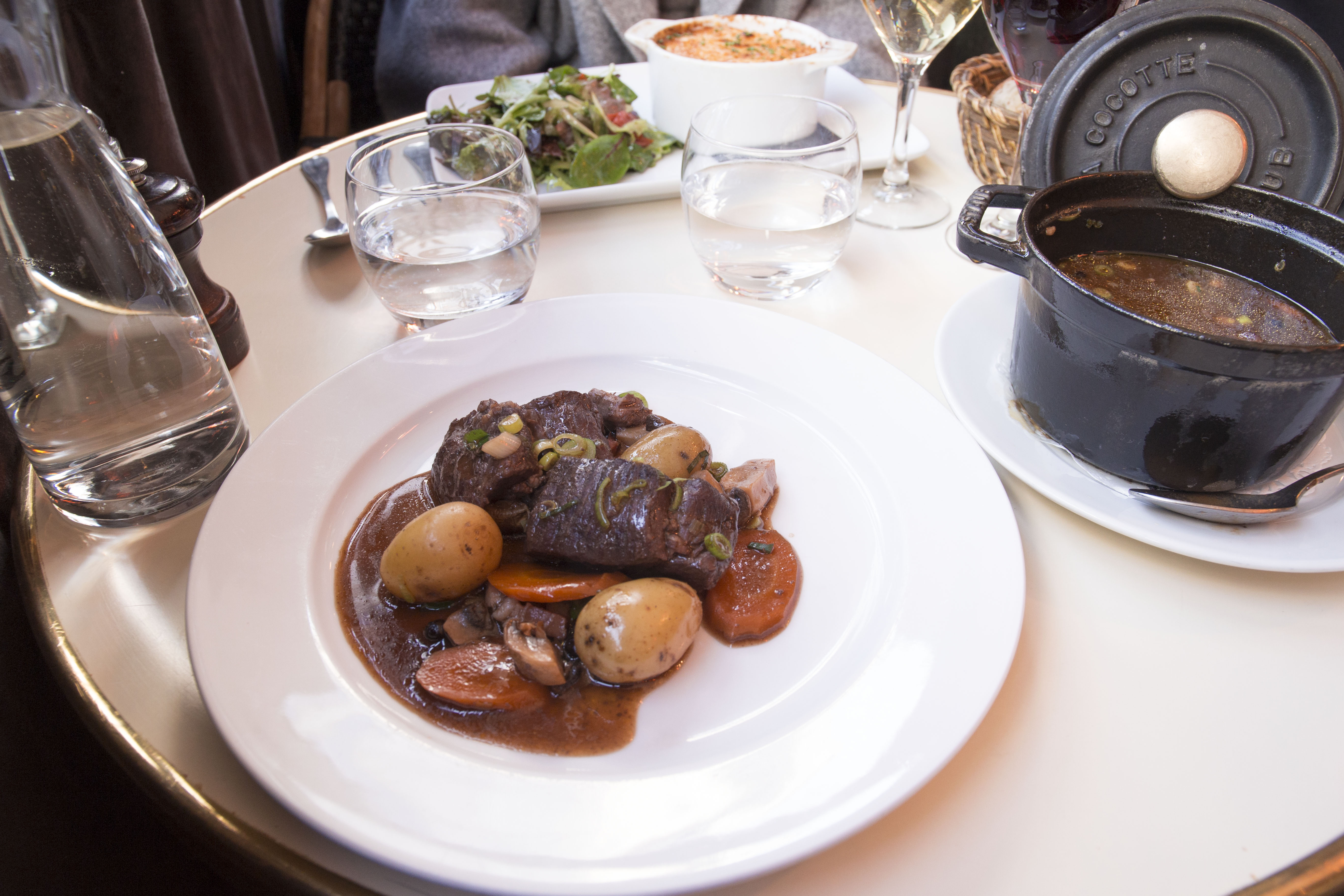 มาถึงไฮไลท์ของทางร้าน นั่นก็คือ Boeuf Bourguignon ที่เสิร์ฟมาในหม้อขนาดใหญ่เพื่อกักเก็บความร้อน ในขณะที่กำลังเปิดฝาหม้อออก กลิ่นหอมของไวน์ก็เตะจมูกเข้าอย่างจัง เจ้านี่คือสตูว์เนื้อวัวตุ๋นไวน์แดงที่มีขั้นตอนการทำที่ค่อนข้างยุ่งยากและต้องใช้ความอดทนเป็นอย่างมาก เริ่มต้นที่การนำเนื้อวัวคุณภาพดีจากแคว้นเบอร์กันดีละไปตุ๋นกับไวน์แดง พร้อมเครื่องเทศอีกมากมายเช่นใบไทม์และใบพาร์สลีย์เป็นต้น ตุ๋นเป็นเวลานานจนเนื้อวัวมีความเปื่อยนุ่ม สีและรสชาติของไวน์ได้ซึมเข้าไปในเนื้อวัวราวกับว่าเป็นส่วนเดียวกัน หลังจากนั้นก็นำเนื้อวัวไปทอดจนเนื้อวัวเป็นสีน้ำตาลทอง ต่อมานำกลับลงไปน้ำซุปไวน์แดงอีกครั้ง พร้อมกับหอมแดง แครอท มันฝรั่ง เห็ด และอีกมากมาย ตุ๋นอีกเป็นเวลา 6 ชั่วโมงจนน้ำซุปมีความเข้มข้น จากนั้นก็นำยกมาเสิร์ฟ เนื้อวัวจะมีเต็มไปด้วยรสชาติและกลิ่นหอมของไวน์แดงอย่างปฏิเสธไม่ได้