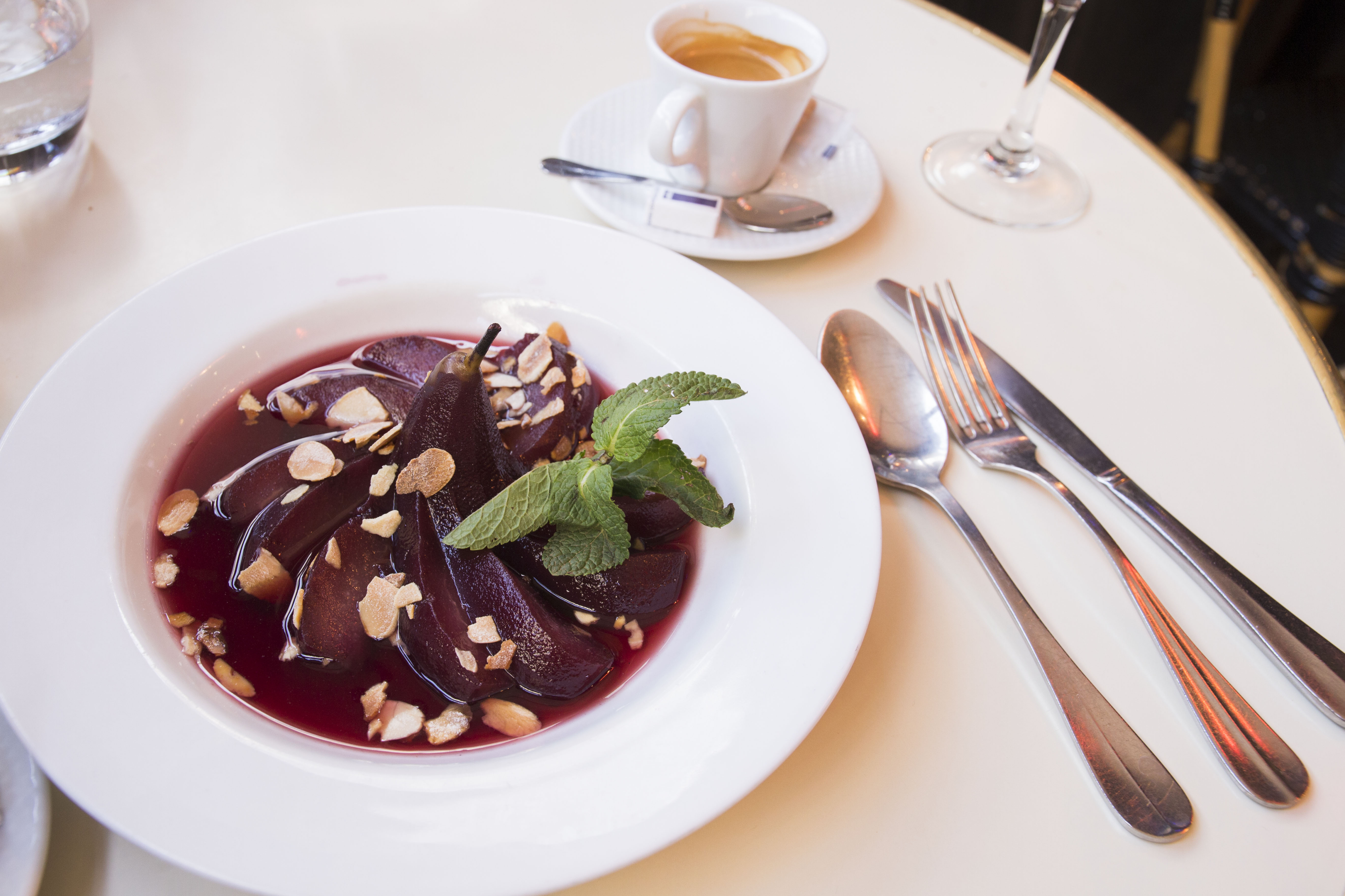 มาถึงขนมหวานที่ก็ยังมีส่วนผสมของไวน์แดงอยู่ นั่นก็คือลูกแพร์ตุ๋นไวน์แดง ที่นำลูกแพร์สดๆมาหั่นเป็นชิ้นพอดีคำลงไปแช่ไว้กับไวน์แดงพร้อมกับเครื่องเทศมากมาย อาทิเช่น ซินนามอน กานพลู และเปลือกเลม่อน เป็นเวลา 24 ชั่วโมง หลังจากจึงเริ่มกระบวนการตุ๋น มีการเติมน้ำตาลเพื่อเพิ่มรสชาติพร้อมกับถั่วอัลมอนด์ลงไป เมื่อปรุงเสร็จเรียบร้อยแล้ว น้ำที่ได้ออกมาจะมีความใสและมีสีเหมือนทับทิมอย่างไรอย่างนั้น ความหวานของลูกแพร์เข้ากันได้ดีกับเครื่องเทศที่นำลงไปแช่ อีกทั้งยังมีเนื้อสัมผัสที่นุ่มและหอมอย่างบอกไม่ถูก