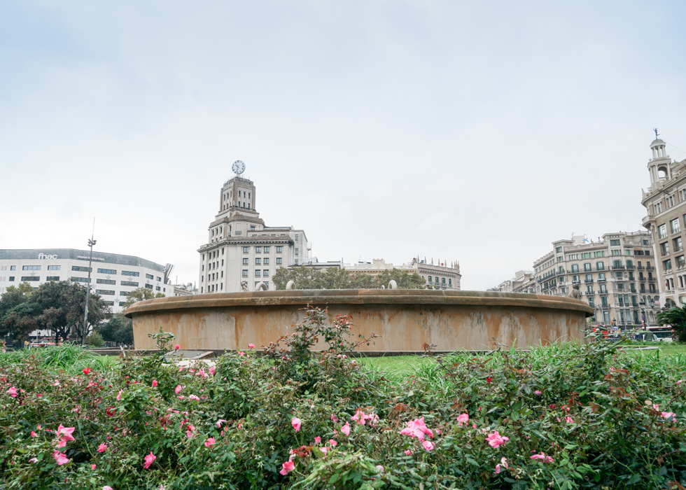 ที่ใจกลางเมืองบาร์เซโลน่า จะมีพลาซ่าตั้งอยู่คล้ายๆกับสวนสาธารณะ เต็มไปด้วยต้นไม้ใบหญ้าและรูปปั้นต่างๆมากมาย เป็นสิ่งแรกที่ใครก็ตามที่เดินทางด้วยรถบัสจากสนามบินบาร์เซโลน่าเข้ามาในตัวเมืองจะต้องเจอ และรอบๆพลาซ่านี้ก็จะมีร้านอาหาร คาเฟ่ตั้งอยู่เรียงราย รวมไปถึงห้างสรรสินค้า แหล่งช้อปปิ้งใหญ่ของบาร์เซโลน่าอย่าง El Corte Ingles