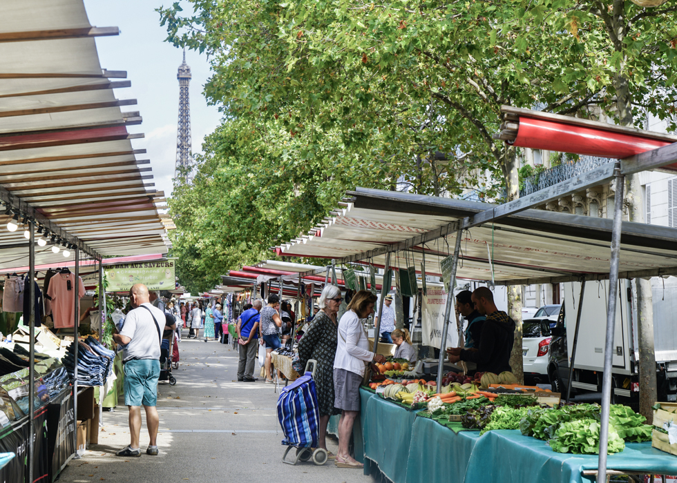 ตลาด Saxe-Breteuil มาพร้อมกับวิวหอไอเฟลที่ด้านหลัง ตลาดนี้เป็นศูนย์รวมของผู้ผลิตที่นำผลิตภัณฑ์มาวางขายให้กับผู้บริโภคโดยตรง ผลิตภัณฑ์ที่ว่านั้น ได้แก่ ผักและผลไม้จากการทำเกษตรแบบปลอดสารพิษหรือแนวทางการทำการเกษตรแบบยั่งยืน