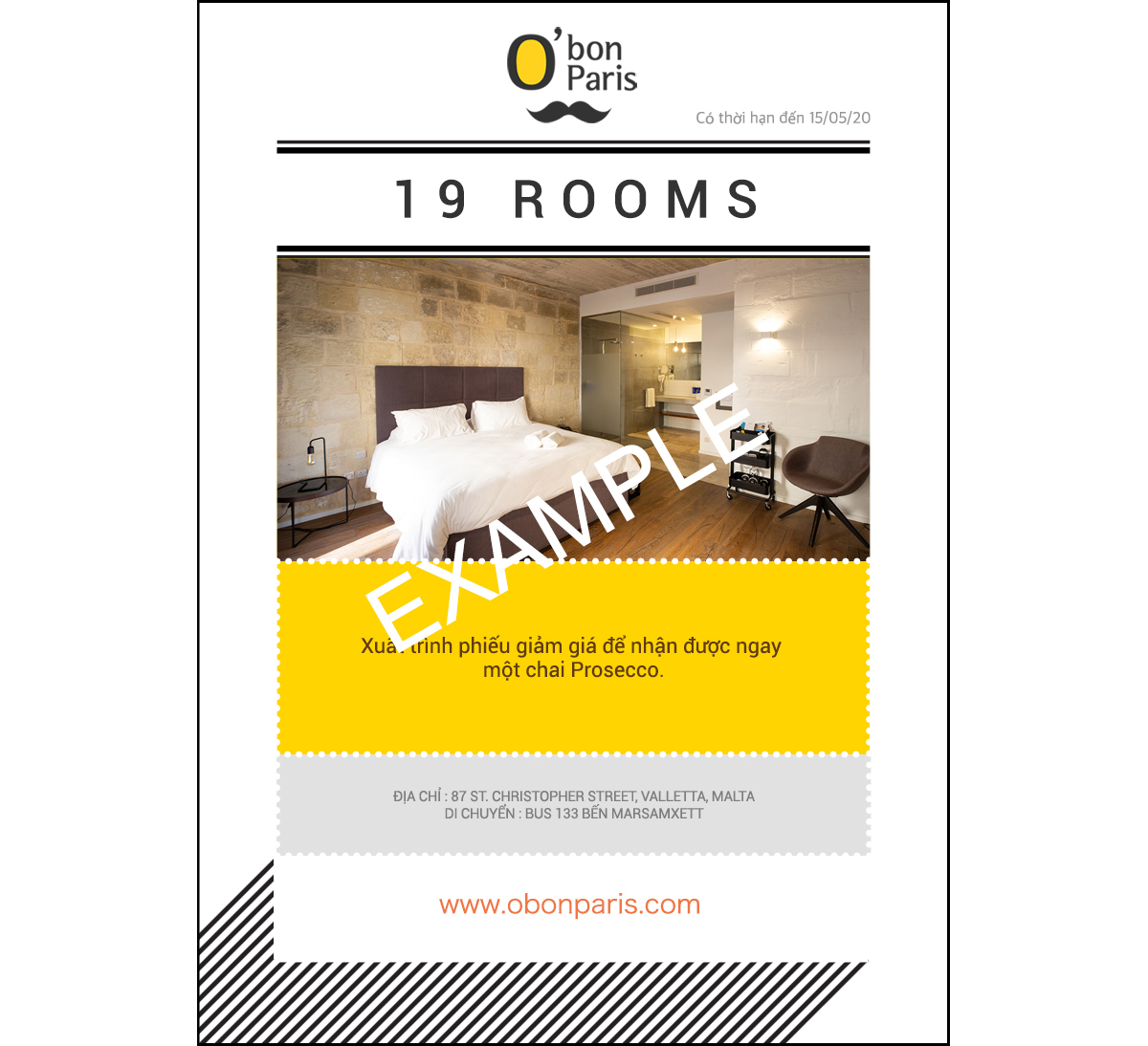 Với phiếu giảm giá của O'bon Paris, bạn sẽ nhận được một chai Prosecco để thưởng thức trong thời gian lưu trú tại khách sạn. Đặt phòng tại trang web chính thức của 19 Rooms.
