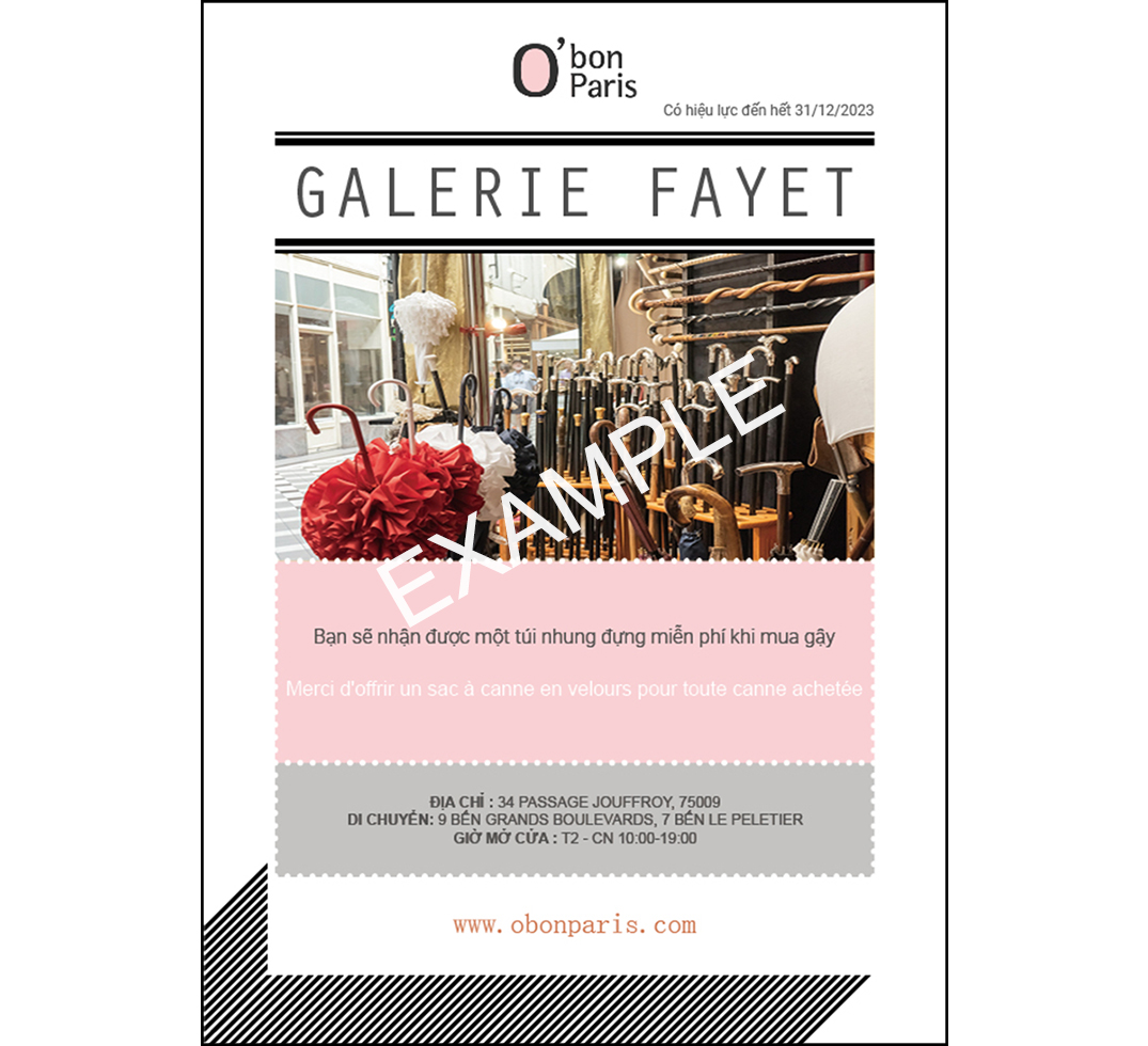 Galerie Fayet là cửa hàng bán gậy truyền thống, made in France. Ra đời từ năm 1909, những sản phẩm chất lượng vẫn được sản xuất và bán tại cửa hàng tại Paris nằm ở Passage Jouffroy.