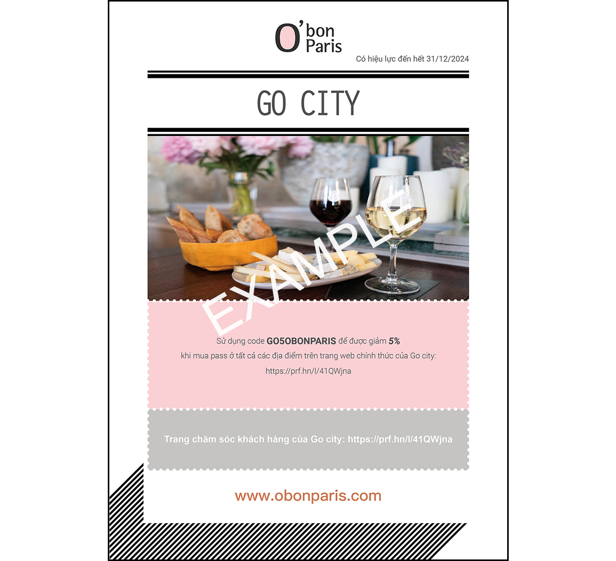 Với code GO5OBONPARIS bạn sẽ được giảm ngay 5% khi mua pass ở tất cả các địa điểm trên trang web của GO City: https://prf.hn/l/41QWjna