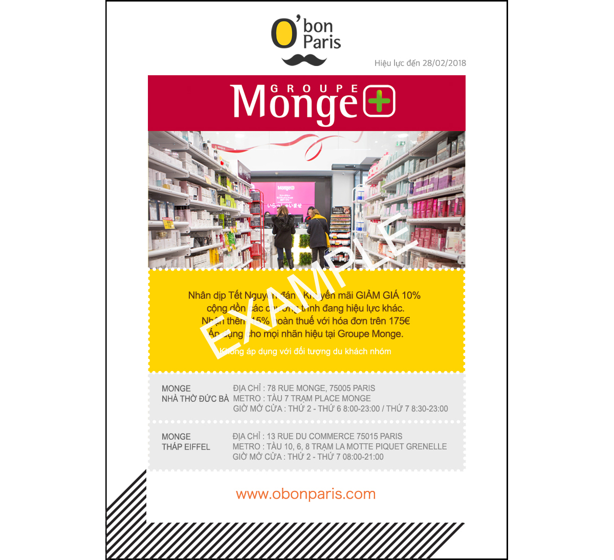 - Phiếu giảm giá 10% có hiệu lực tại các cửa hàng thuộc PHARMACIE GROUPE MONGE.