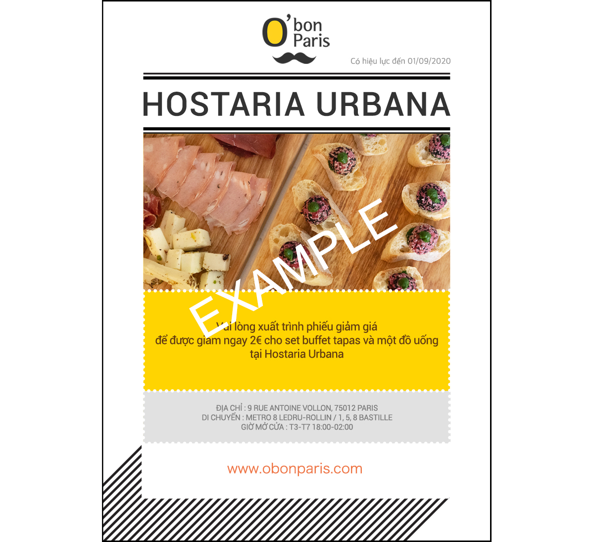 Tại kinh đô ánh sáng, một trong những việc bạn không muốn bỏ qua là thư giãn trong một quán bar đẹp và tận hưởng cảnh đêm. Nếu bạn muốn có trải nghiệm tuyệt vời về đêm ở Paris đúng điệu, bạn nên thử "Apéritif". Không chỉ ở Pháp mà còn ở nhiều nước khác ở châu Âu, họ thường thưởng thức một số đồ uống với thức ăn nhẹ, dễ dàng cầm tay trước bữa tối. Nếu bạn muốn cảm nhận sự rung cảm thực sự của Paris, HOSTARIA URBANA là địa chỉ hoàn hảo. Với phiếu giảm giá của O'bon Paris, bạn có thể được giảm ngay 2 € cho thực đơn set cocktail và tapas tự chọn vào thứ ba và thứ tư.