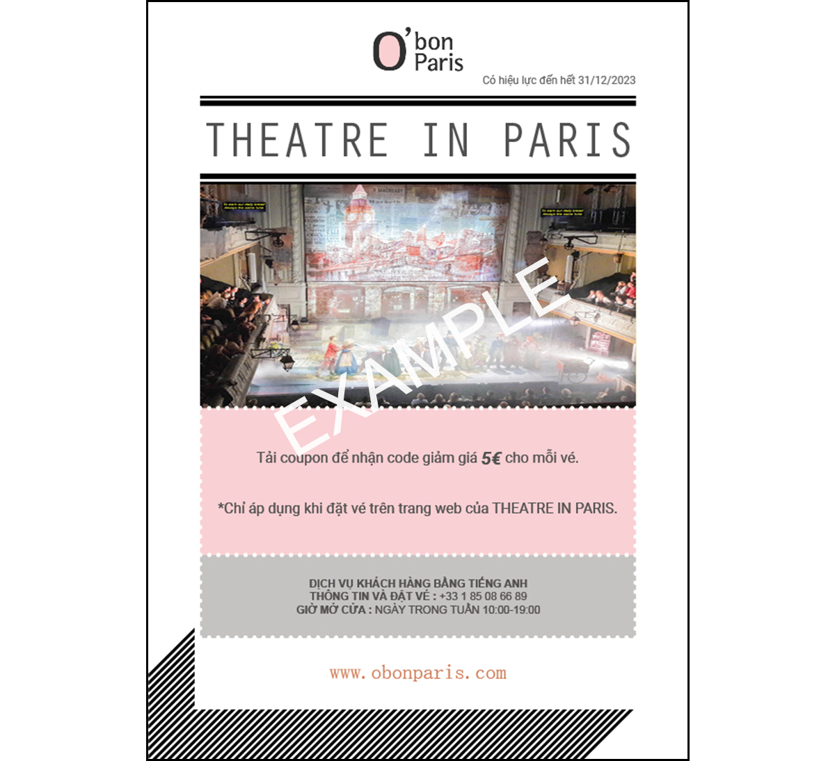 Pháp, thủ đô của các loại hình nghệ thuật văn hóa. Đặc biệt, kịch rất được ưa chuộng, người Pháp đến nhà hát khá thường xuyên. Bạn muốn thử trải nghiệm nhưng lo lắng vấn đề ngôn ngữ? Theatre in Paris các vở kịch có phụ đề tiếng Anh hoặc 100% chương trình tiếng Anh, là sự lựa chọn không tồi. Với mã giảm giá, bạn sẽ được giảm ngay 5 € trong khi đặt vé qua trang web chính thức của Theatre in Paris.