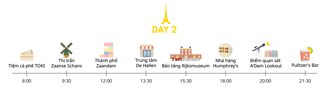 Một ngôi làng cối xay gió, cách Amsterdam 30 phút đi tàu. Bạn có thể đến đây bằng xe buýt hoặc tàu. Khi bạn đi xe buýt, sẽ mất nhiều thời gian hơn tàu nhưng bạn sẽ đến gần ngôi làng hơn, trong khi bạn phải đi bộ một chút từ ga xe lửa khi bạn đi tàu. Bạn có thể khám phá các bảo tàng cối xay gió và nhà máy sản xuất giày gỗ. Có một vài cửa hàng lưu niệm nơi bạn có thể mua những món quà lưu niệm dễ thương liên quan đến hoa tulip và giày gỗ. Khi bạn vào bảo tàng cối xay gió De Kat, bạn có thể đến rất gần cánh của cối xay gió. Nếu bạn có đủ thời gian, tốt nhất là bạn nên thuê một chiếc xe đạp để tham quan làng hoặc cũng có một tour du lịch bằng tàu thủy ở Zaanse Schans. Nếu bạn chỉ đơn giản là đi bộ tham quan mà không có bất kỳ hoạt động nào thì 2 giờ sẽ là khá đủ.
