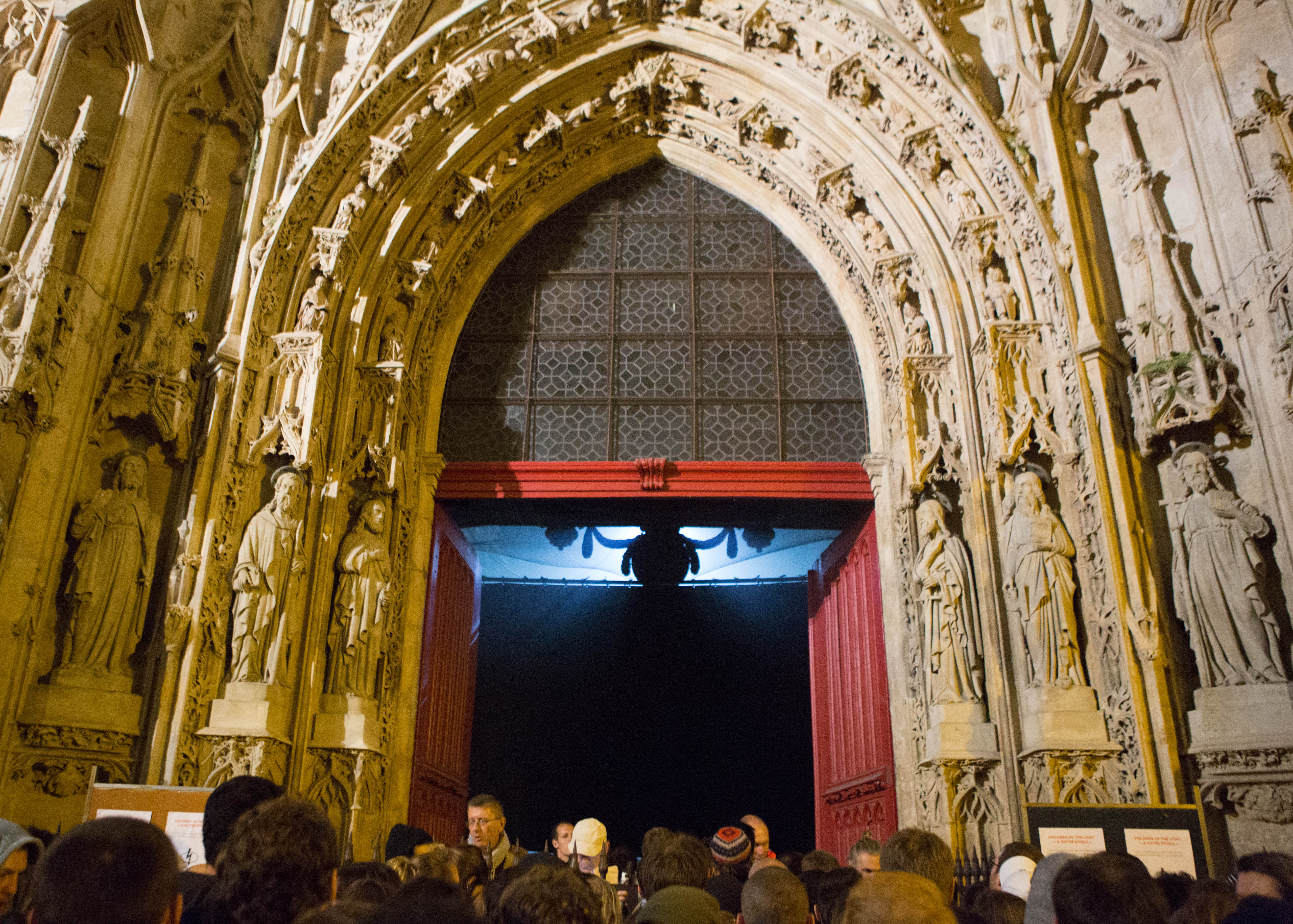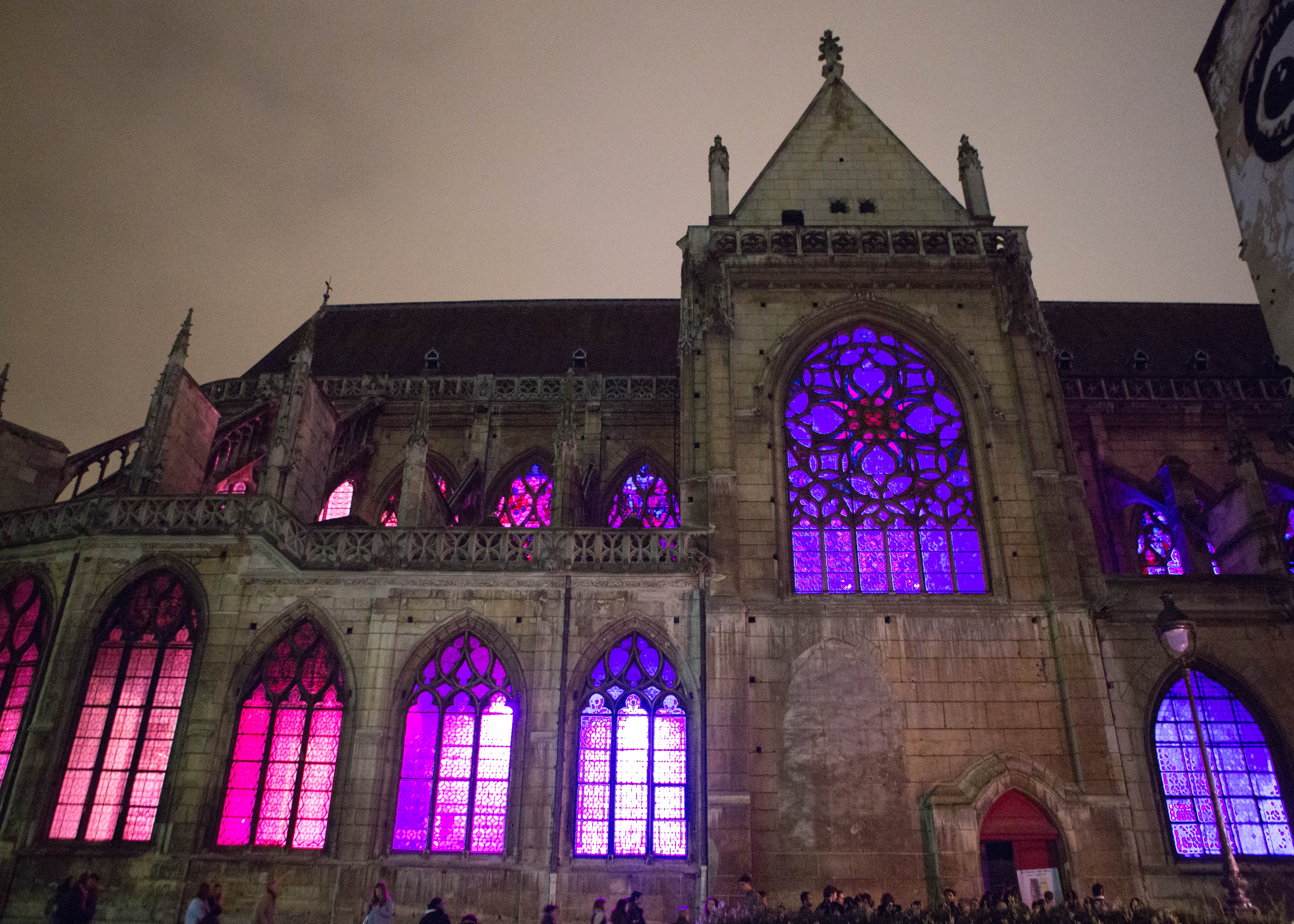 Tại Nhà thờ Saint Merri, nằm ở chung quanh hội trường, một buổi biểu diễn ánh sáng nghệ thuật với chủ đề TRẺ EM ĐÈN đã được chuẩn bị. Mọi người đang cố gắng để có thể vào khiến cảnh tượng khá đông đúc.