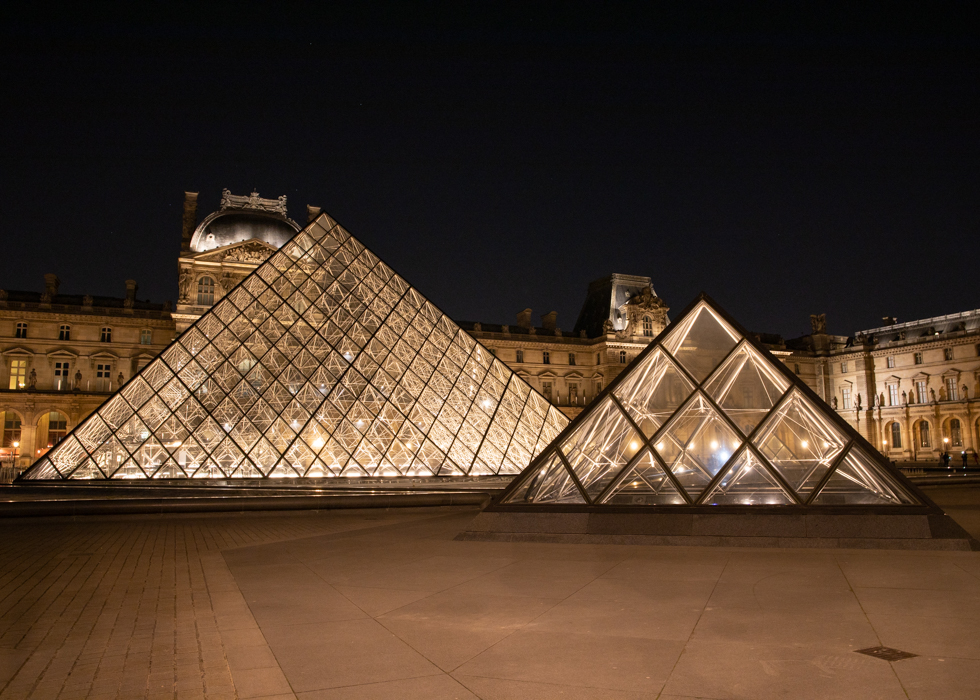 Khung cảnh với kim tự tháp làm bằng kính của bảo tàng Louvre là điểm nhấn ấn tượng. Vẻ đẹp của Paris cho chúng ta cảm nhận được bộ mặt huyền bí của thành phố đặc biệt khi về đêm.