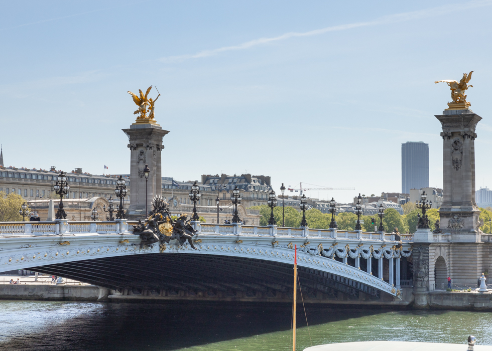 Từ cây cầu, bạn có thể tìm thấy Tháp Eiffel ở phía sau. Khung cảnh Paris và cây cầu tuyệt đẹp Alexandre III là những địa điểm chụp ảnh bạn không muốn bỏ lỡ.