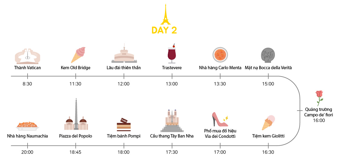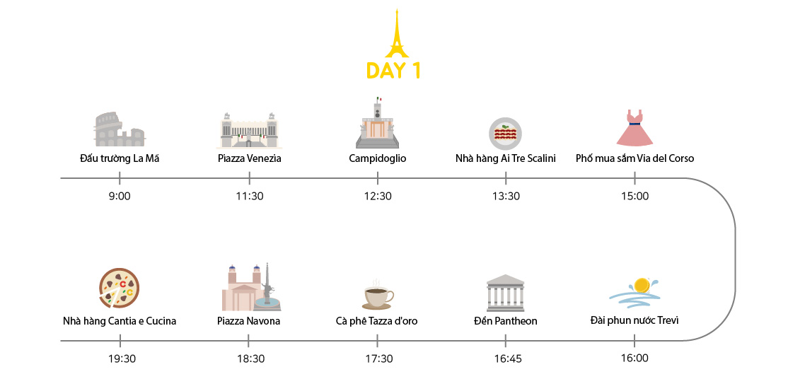 Dưới đây là lịch trình hai ngày ở Rome của O'bon Paris, có thể sẽ giúp bạn lên một lịch trình hợp lý nhất cho riêng mình.