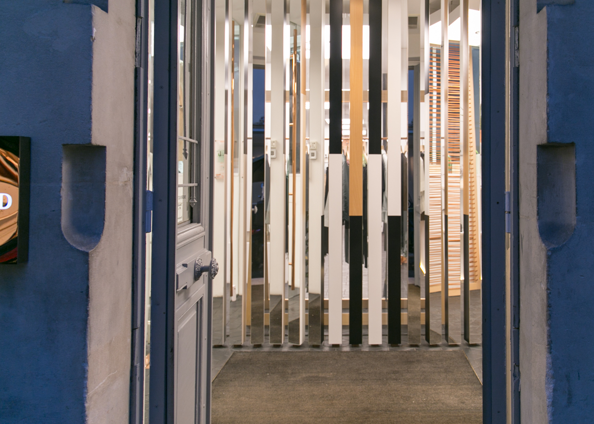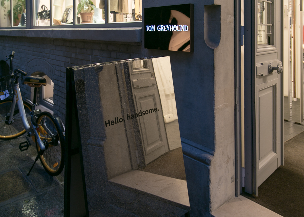 Lối vào TOM GREYHOUND được trang trí với gương soi thiết kế hiện đại so với căn hộ kiểu cổ điển kiểu Paris. Được thiết kế bởi Pierre Beucler và Jean-Christophe Poggioli, cửa hàng đã tạo ra nhiều thương hiệu cao cấp nổi tiếng thế giới và các cửa hàng bách hóa. Tầng với mô hình vuông màu đen gợi nhớ lại thiết kế logo cổ điển của Pierre Hardy, một nhà thiết kế giày.