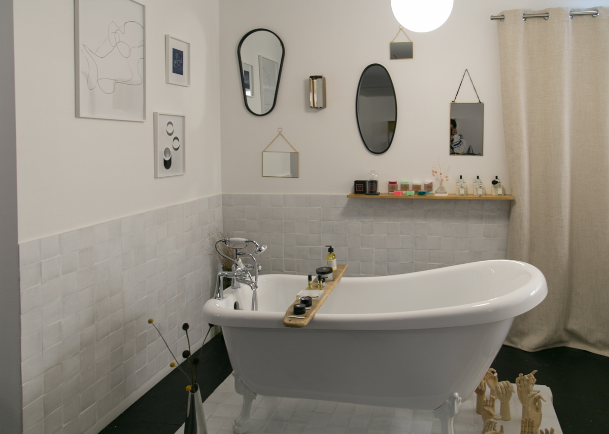Mặc dù chưa có nhiều thương hiệu, trong cửa hàng TOM GREYHOUND vẫn còn một không gian trưng bày độc đáo với một bồn tắm, nơi này được sử dụng để trưng bày không gian cho các sản phẩm thiết kế và làm đẹp.