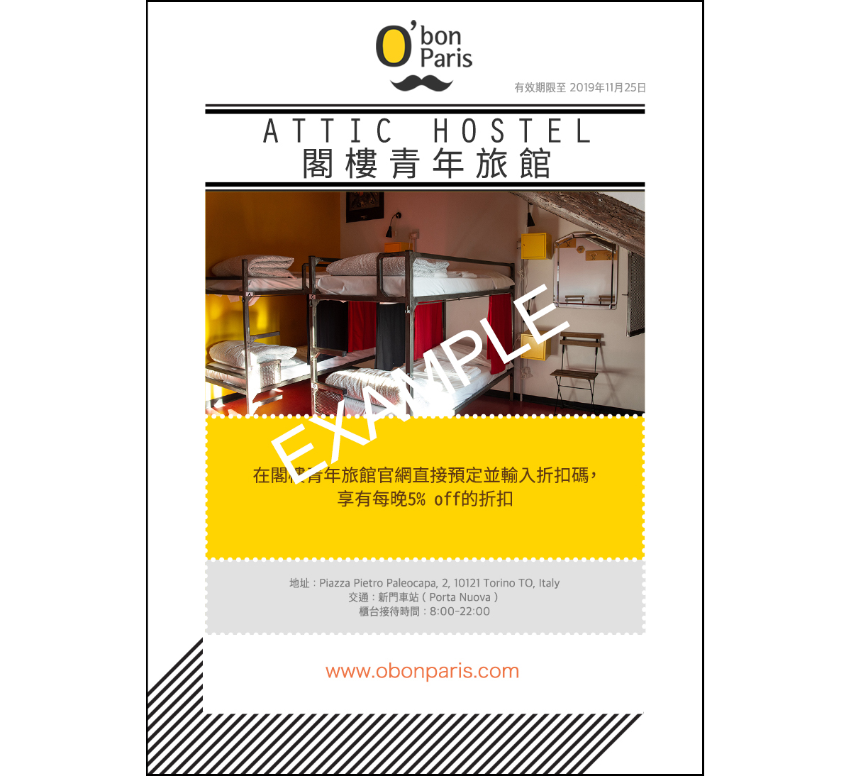 無論如何,如果你來到都靈旅遊,閣樓青旅隨時歡迎你。下載我們的優惠券領取折扣碼,到閣樓青旅的官網上預訂並輸入代號,就享有每晚5%的住宿折扣哦!
