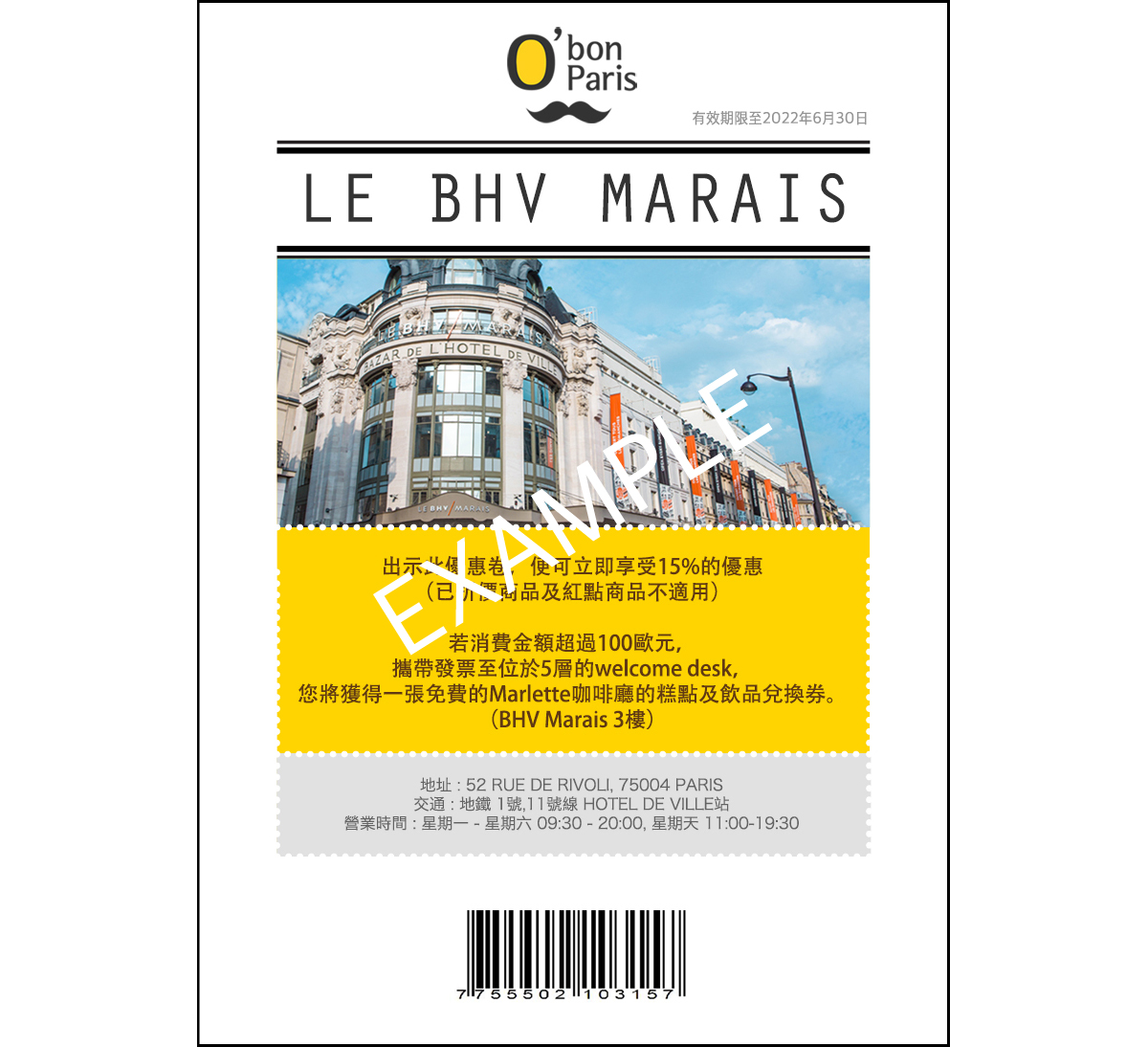 - 在 LE BHV MARAIS 結帳時,直接出示拿在 O'bon Paris 下載的優惠券即可使用。