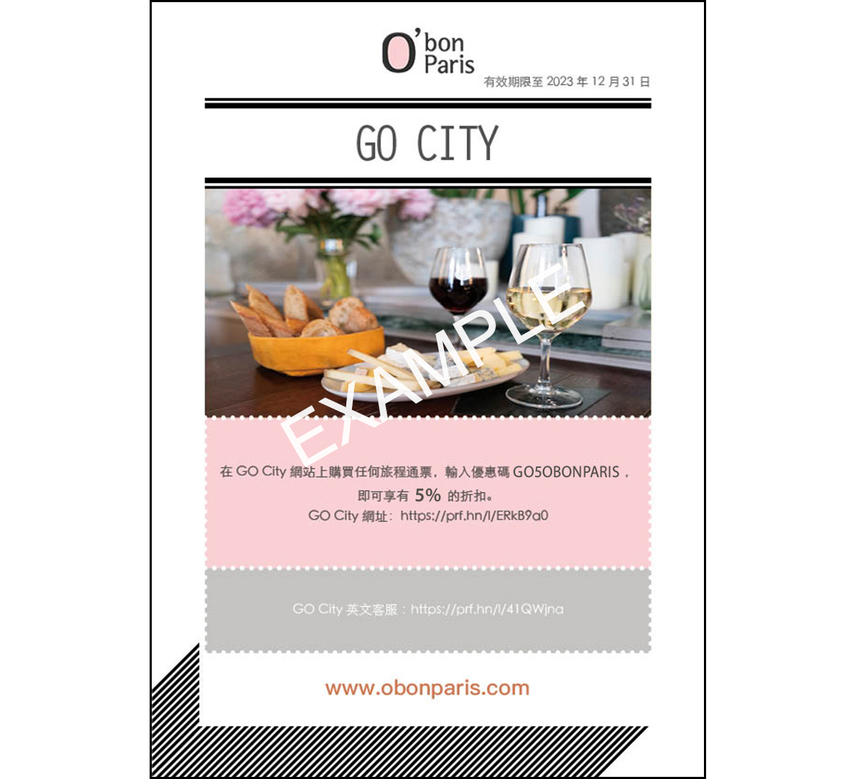 只要在GO City網站上,購買城市旅遊證時輸入促銷碼GO5OBONPARIS,就可以立即享有5%折扣:https://prf.hn/l/41QWjna