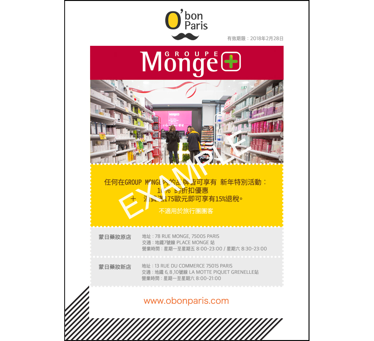 (4) 請至Groupe Monge蒙日藥妝店使用您的優惠券,享用優惠。