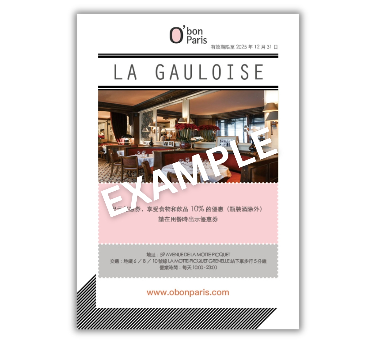 結帳時請於櫃檯同時出示此優惠券,才能享有優惠。付款後,您可於您的收據上找到 O'bon Paris 帶給您的優惠金額。