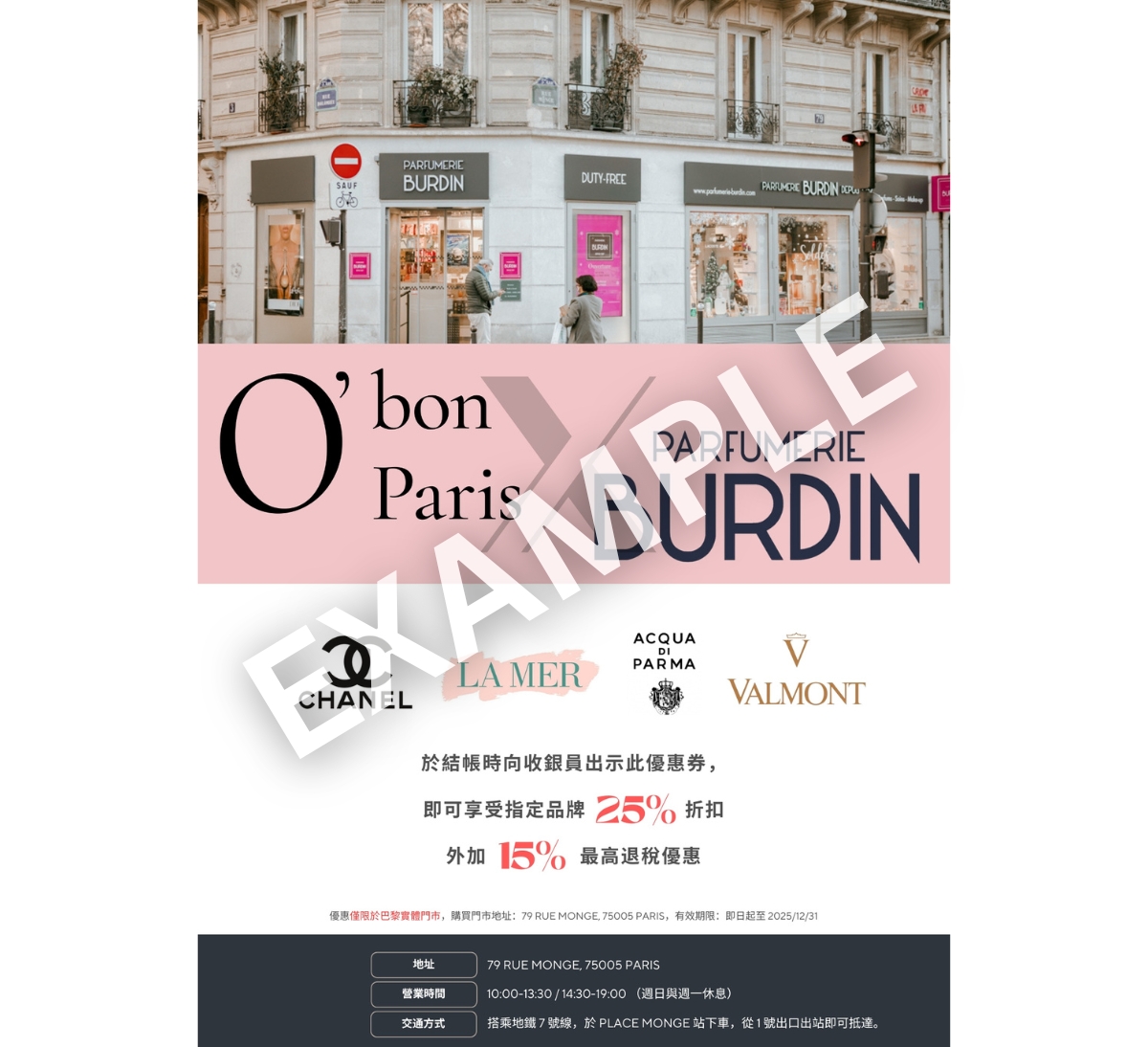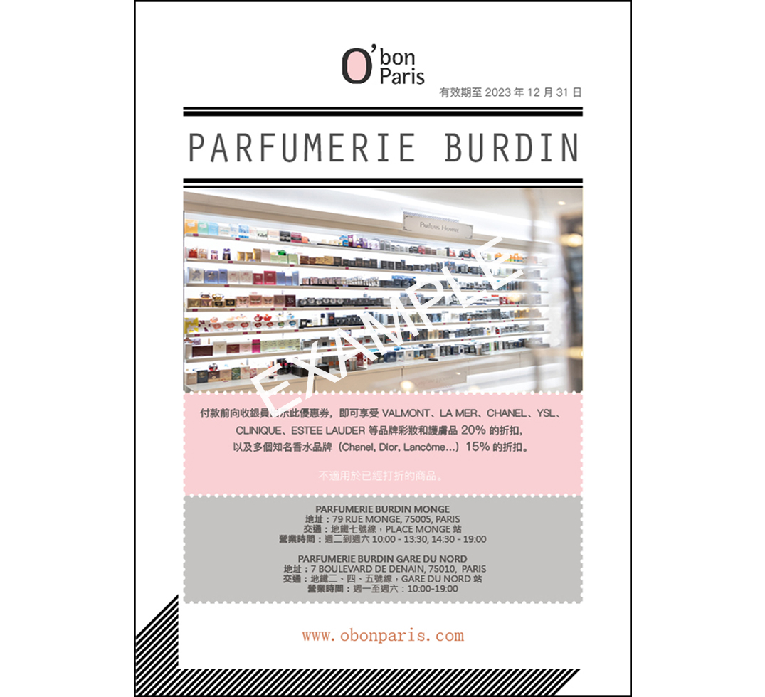 Burdin是一家由家族經營的法國香水店,創建於1937年。您可以在這裡找到最知名品牌(香奈兒、迪奧、嬌蘭、倩碧、YSL、蘭蔻、雅詩蘭黛、資生堂……)的香水、化妝品和護膚品。店內人員會根據您的個人要求幫您挑選最適合您的產品。下載您專屬的O’bon Paris優惠券,可立即享受 Chanel 香奈兒、 La Mer 海洋拉娜、Acqua di Parma 帕爾瑪之水及瑞士頂級護膚品牌 Valmont 25%的折扣。店內已經打折的商品不可重複打折。每次消費時,您還可以獲得免費的樣品或小禮物。
