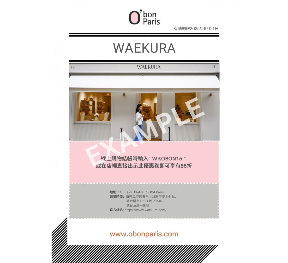 出示此優惠券或使用代碼 "WKOBON15" 即可享有 15% 的折扣。