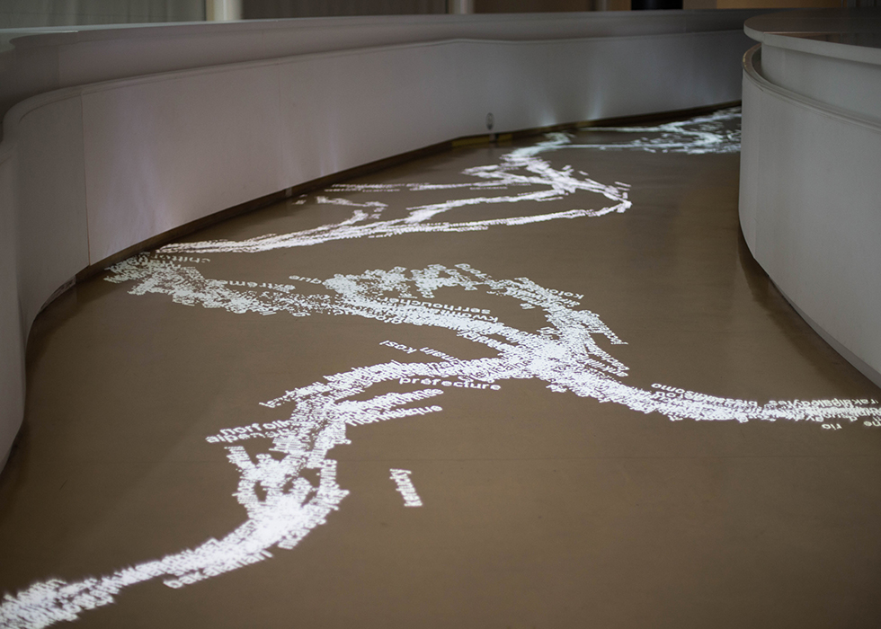 象徵著河水的發源與匯流成大海的主題運用在必經的垂直交通旋轉坡道上,通過數碼影像技術把和“碼頭”相關聯的隱喻以文字的方式做成了流淌的“水”的表現形式,神秘——連貫——似有非有—— 以致無形,充滿了讓·努瓦爾對隱喻駕輕就熟的操縱。