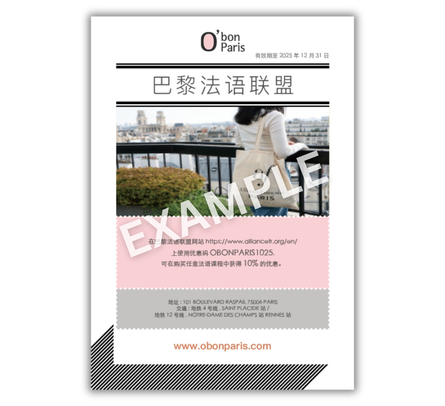 在巴黎法语联盟网站https://www.alliancefr.org/en/上使用优惠码OBONPARIS1025,可在购买任意法语课程中获得10% 的优惠。