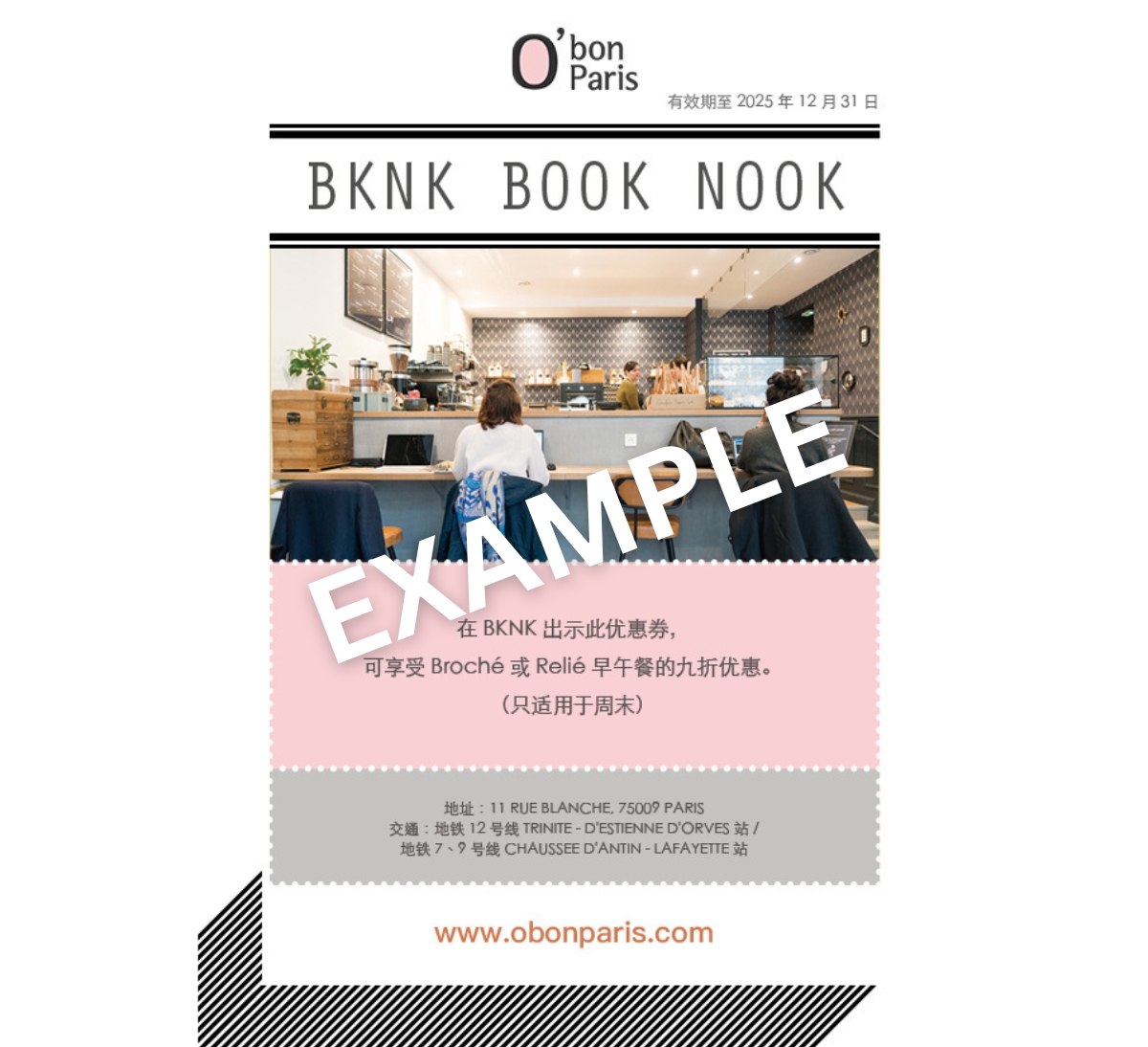 BKNK 是一家与图书出版商 Beta Publisher 合作的咖啡店。他们每个周末都会提供手工制作的美味早午餐。距离著名的旅游景点仅一步之遥,这里是享用手工早午餐的理想场所。下载欧棒巴黎的优惠券就能获得 Broché 早午餐或 Relié 早午餐 10% 的折扣哟!