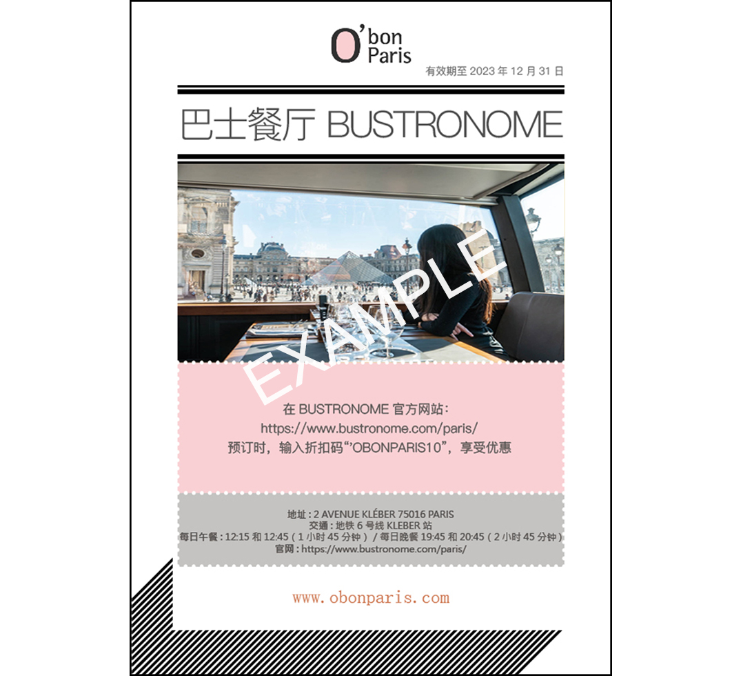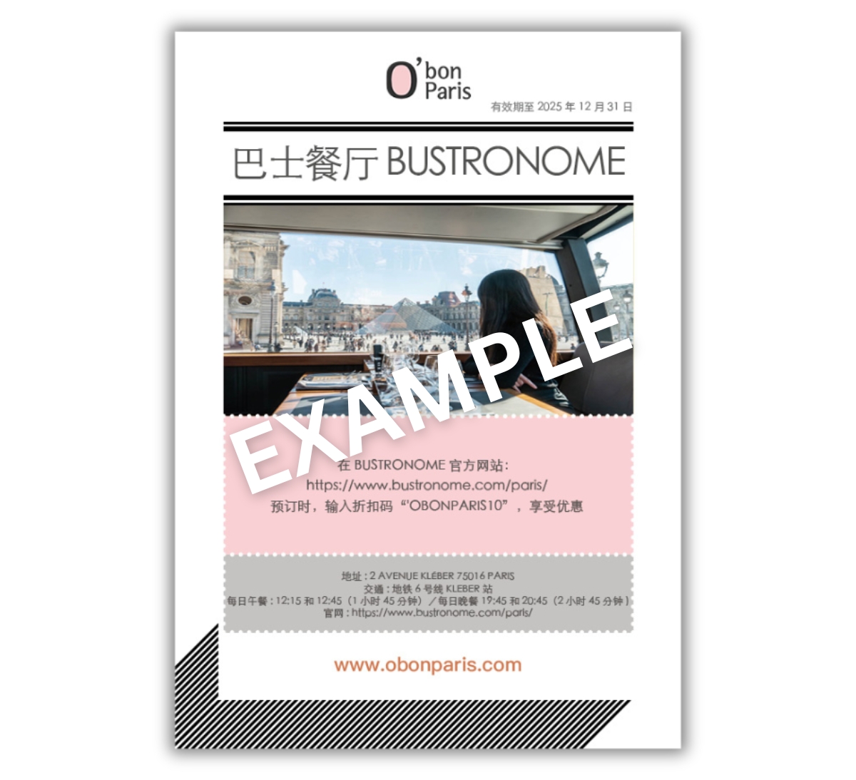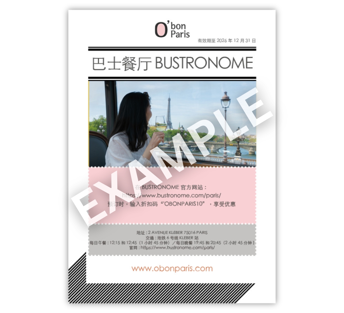 Bustronome巴士环游之旅,会是您在巴黎拥有的最独特的体验之一。 您只需坐上观光大巴,便可在尽情享受巴黎的全景同时,享用正宗的法式菜肴,包括从开胃菜到主菜和甜点。使用O'Bon Paris的特别优惠代码,可以享受总价9折优惠,包含餐食和饮料。 前往BUSTRONOME官网,预订时输入欧棒巴黎的独家折扣码,开启您的巴黎美食观光之旅吧!