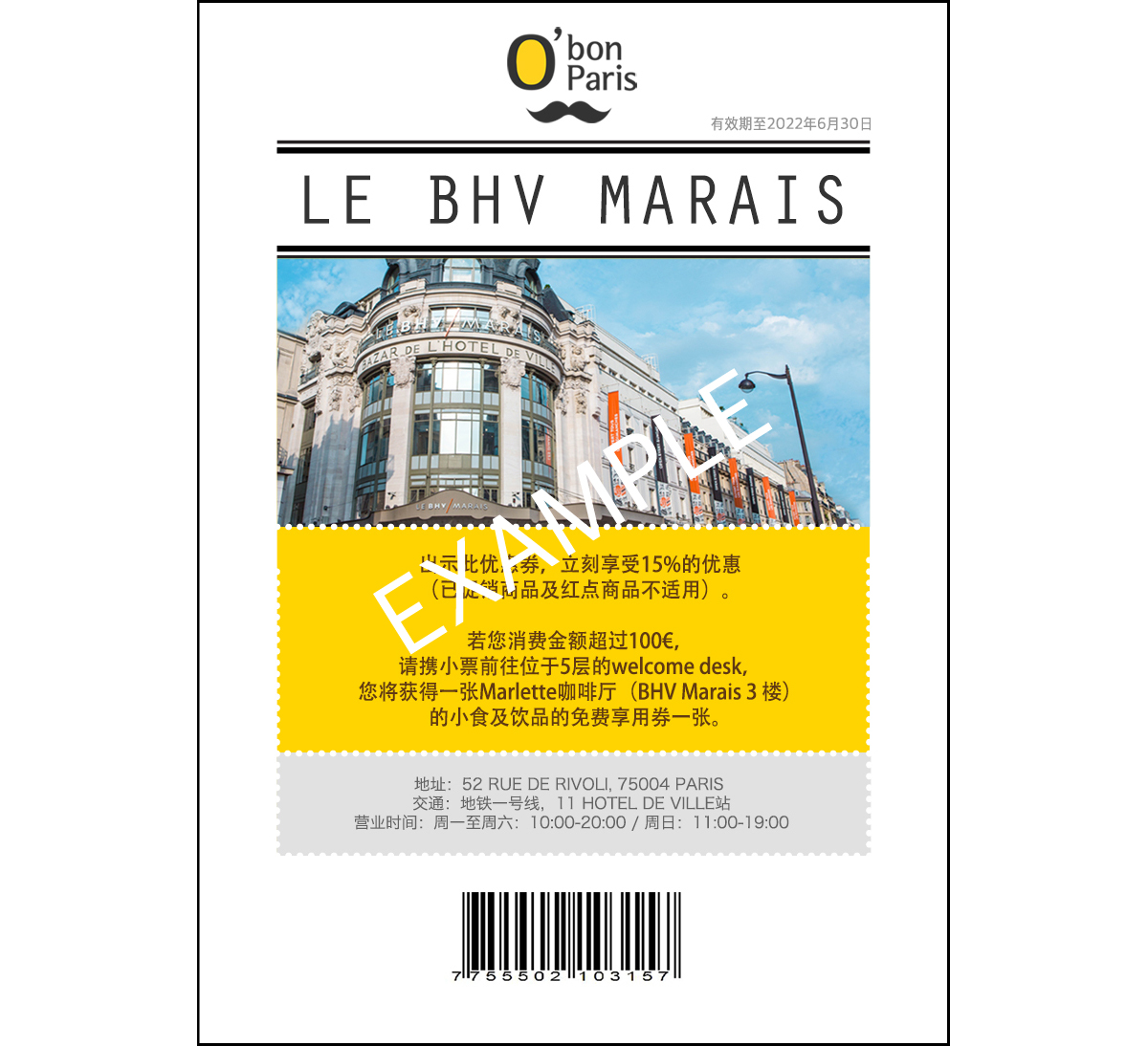 - 在LE BHV MARAIS购物可以享有指定店家折扣(不适用标示红点的品牌和已折扣商品) 。