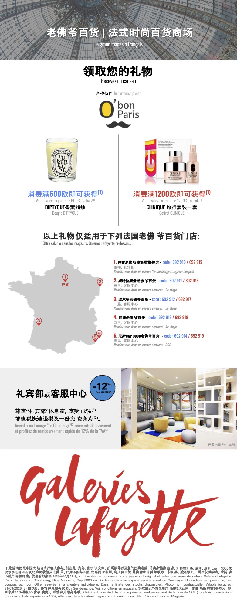 使用 O’bon Paris 的优惠券,您还可以换取满额好礼!您可以累计您在老佛爷百货的各种消费(不包含餐厅或咖啡馆)您必须点击下方的「马上领取优惠券」下载以下优惠券(此页面的截图无法使用)。如未收到,请检查您的垃圾邮件信箱。 600欧元和1200欧元的优惠券需要出示退税单和与退税单相关的护照原件,才能在一楼的 「Le Concierge 至尊礼宾部」领取礼品(LV/Prada 旁边)。此活动仅限于自由行客人于巴黎老佛爷奥斯曼百货公司使用,一人仅限兑换一次。